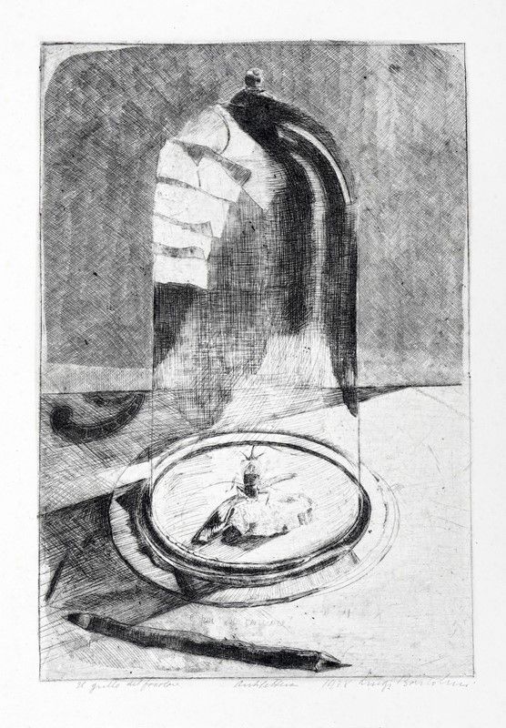 Acquaforte su velina applicata. mm 300x200. Foglio: mm 440x345. Iscrizione "e poi si muore!" in lastra in basso al centro. Firmata a matita in basso a destra, "Antilettera" a matita in basso al centro e titolo a matita in basso a sinistra. Timbro a secco di Luigi Bartolini all'angolo inferiore destro del foglio. Opera conosciuta anche con il titolo di Vita borghese.