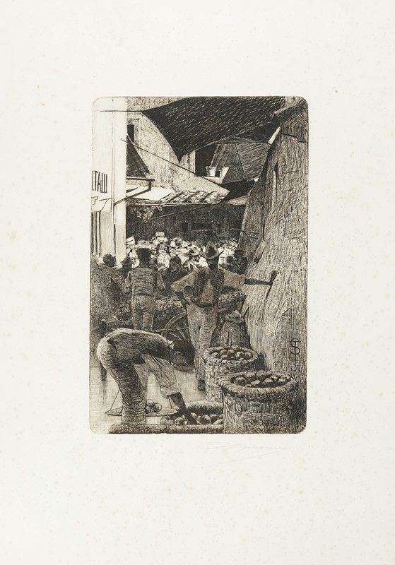 Acquaforte. mm 365x235. Foglio: mm 640x473. Monogrammata in lastra in basso a destra, firmata a matita in basso a destra.