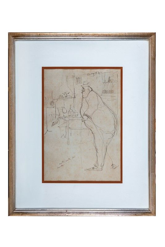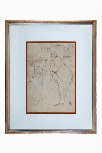 Penna e inchiostro di china bruno su carta. mm 310x210 (visibili). Iscritto in basso a sinistra: "entri entri Sor Conte...". Al verso del supporto firma di Giuliano Matteucci, autore e titolo dell'opera.