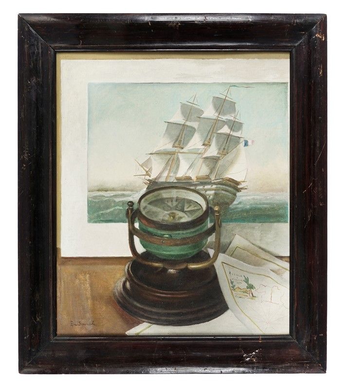 Olio su masonite. cm 57x48. Firmato in basso a sinistra. La bussola rappresenta l'elemento centrale. Alla sua base troviamo una mappa con l'iscrizione "Isola di Minorca", mentre un veliero sullo sfondo solca il mare sotto la sua bandiera francese alla destra.