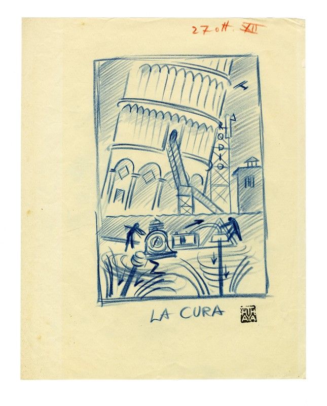 Pastello celeste su carta leggera filigranata. mm 290x230. Titolata al margine inferiore, Datata secondo l'era fascista in carboncino rosso al margine superiore. Timbro d'artista ad inchiostro nero in basso a destra. Opera accompagnata da certificato di autenticità su fotografia con timbro e firma dell'Archivio Thayaht & Ram.
