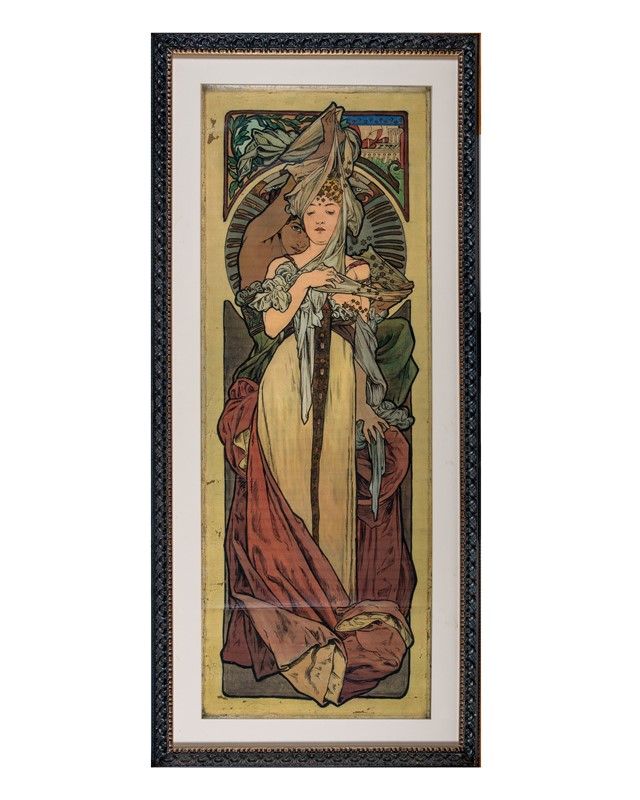 Cromotipia. mm 1000x365. L'immagine corrisponde alla parte sinistra del manifesto Österreich auf der Weltasstellung Paris 1900 eseguito dall'artista ceco attivo a Parigi per pubblicizzare il padiglione austriaco all'Esposizione Universale del 1900. Tuttavia questa stampa, che riteniamo essere d'epoca, differisce non solo per le dimensioni più grandi ma anche per numerosi dettagli, prima di tutto all'angolo superiore sinistro dove le foglie di alloro non formano il cerchio con le lettere presente nel manifesto e per l'assenza della firma in basso a sinistra, come se l'immagine fosse stata poi modificata in fase di traduzione litografica. Potrebbe trattarsi forse di un modello preparatorio la cui riproduzione evidenzia anche alcune abrasioni o altri difetti della carta presenti nei margini. Si tratterebbe quindi di un documento di notevole rarità. Pubblicato in La vergine e la femme fatale. L'eterno femminino nell'immaginario grafico del Simbolismo e dell'Art Nouveau, a cura di Emanuele Bardazzi, catalogo della mostra, Sesto Fiorentino 26 marzo-28 maggio 2017, Firenze, Polistampa, 2017, p. 168, n. 234.