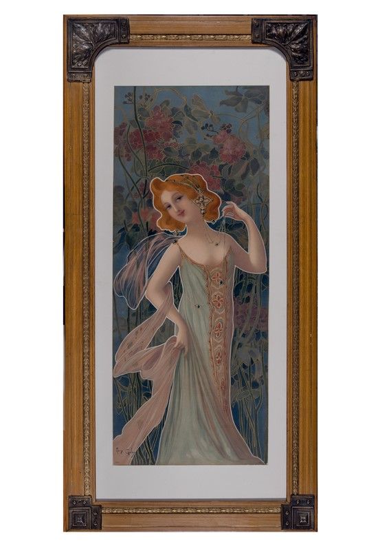 Litografia a colori. mm 980x400. Stampata da Imp. Clément, Tournier & C. Genève. Uno dei soggetti meno comuni nella produzione tipicamente Art Nouveau dell'artista, particolarmente devota alle grazie femminili e alle decorazioni floreali. Pubblicata in La vergine e la femme fatale. L'eterno femminino nell'immaginario grafico del Simbolismo e dell'Art Nouveau, a cura di Emanuele Bardazzi, catalogo della mostra, Sesto Fiorentino 26 marzo-28 maggio 2017, Firenze, Polistampa, 2017, p. 167, n. 231.