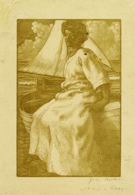 Xilografia policroma a 2 legni. mm 246x165. Foglio: mm 320x220. BOSSAGLIA-MAVILLA, 143; GIOVANNINI, P. 71. Monogrammata nella matrice in basso a sinistra. Firmata a matita in basso a destra. Iscrizione parzialmente cancellata a matita sotto la firma. Rarissimo esemplare stampato a mano dall'artista di una xilografia che comparve nel numero monografico de "L'Eroica", a. IV, Vol. I, Fasc. i, II, gennaio-febbraio 1914. Rispetto ad essa il segno appare molto più deciso anche grazie alla colorazione verdastra piuttosto del rossiccio pallido della versione editoriale. Nel luglio del 1912 Barbieri si trovava a Fiumetto in Versilia (lettera a De Carolis del 27 luglio 1912, Archivio De Carolis). Risale a questo periodo l'esecuzione della xilografia La vela (La barca/Sulla spiaggia) che ritrae la cugina Guerrina Cherici seduta su una barca. Esposta a Levanto nello stesso anno.
