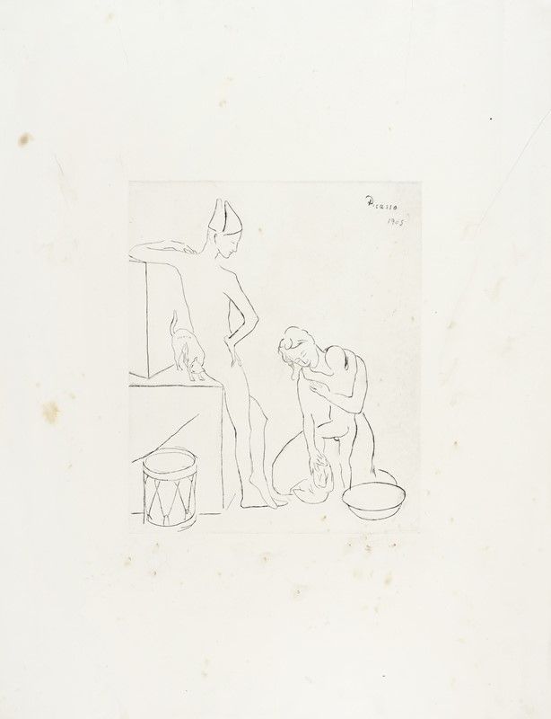 Puntasecca. mm 340x285. Foglio: mm 728x560. BLOCH, 12. Firmata e datata in lastra in alto a destra. Bellissima incisione realizzata nella gioventù di Picasso, facente parte delle 14 per la Suite des Saltimbanques. Opera nel I ed unico stato con ampi margini.