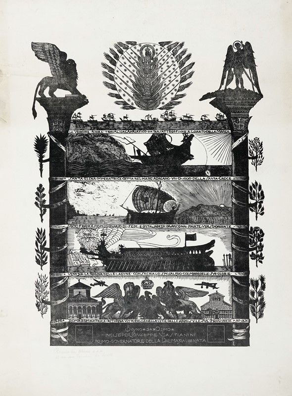 Xilografia. mm 545x420. Foglio: mm 797x607. Iscrizione: "LA · VERGINE · NIGRA · TRAVALICA · L'ADRIATICO · DA · TERSATTE · DI · FIVME · A · LORETO · DELLA · MARCA / SANTA · ELENA · GETTA · NEL · MARE · ADRIANO · UN · CHIODO · DELLA · SANTA · CROCE / SANTO · FRANCESCO · MISSIONARIO · DI · FEDE · E · DI · ITALIANITA' · DA · ANCONA · PARTE · VERSO · ORIENTE / VENEZIA · LA · REGINA · DELLE · LAGVNE · CONSACRA · LO · SPOSALIZIO · COL · MAREDELLE · SVE · GLORIE / ROMA · DOMINATRICE · RITORNA · VITTORIOSA · NELLA · LVCE · DELLE · ARMI · SV · LE · SVE · PROVINCIE" in lastra sopra ogni pannello illustrato. Data in lastra al margine sinistro. Firma e dedica a Tonnini da Loreto a matita in basso a sinistra.