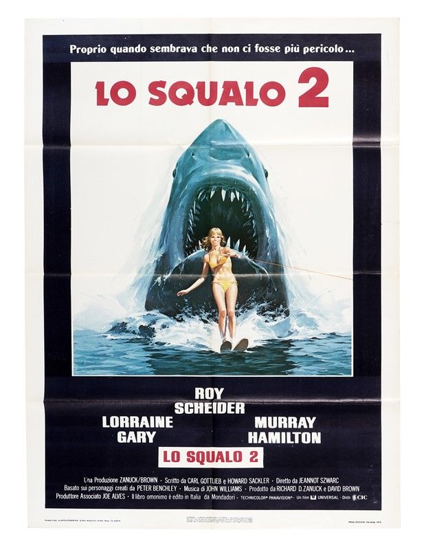 Stampa a reticolo offset in 2 fogli. mm 1280x900. Foglio: mm 1390x1000. Titolo e cast a stampa al margine inferiore. Dati editoriali e dettagli sulla pubblicazione lungo l'estremo margine inferiore. Iconico poster in prima edizione italiana del sequel di Jaws (Lo squalo), pubblicato contemporaneamente negli Stati Uniti ed in Italia nel 1978. Sotto la direzione e regia di Jeannot Szwarc, Lo squalo 2 esce lo stesso giorno di Grease (il musical di Randal Kleiser), superandolo ogni concorrenza di incassi per lo stesso anno.