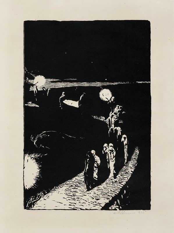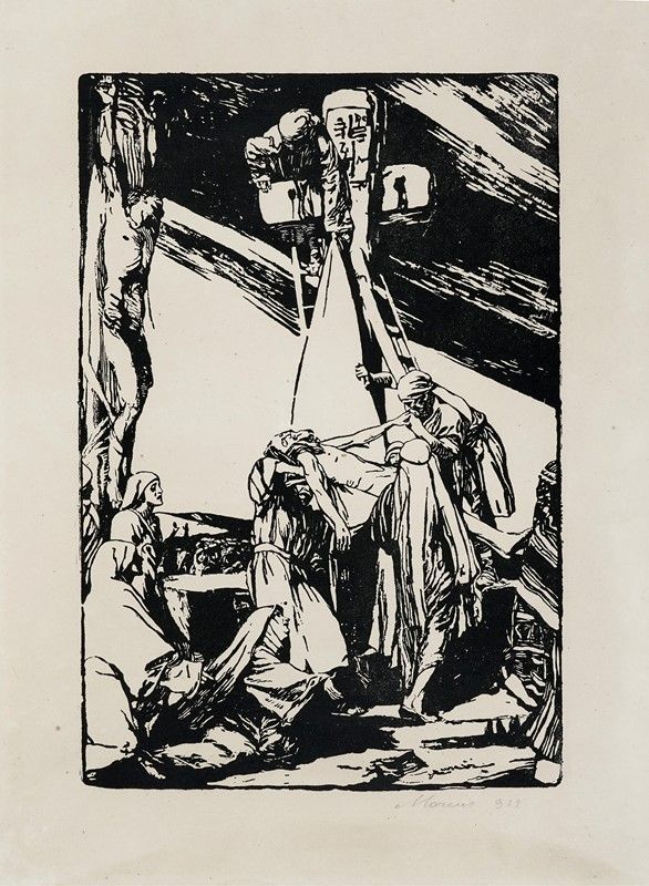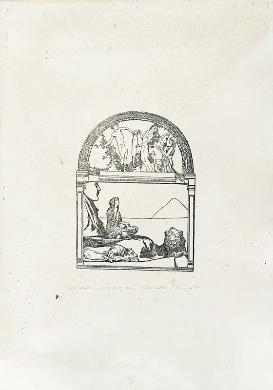 Raccolta di 13 incisioni. mm 70/385x125x260. Foglio: mm 480/495x330/370. Una tavola presenta la firma e dedica a Salvadori iscritte a penna e inchiostro di china al margine inferiore. Altre due incisioni sono firmate e datate. Sartorio eseguì i disegni originali a china in più riprese fino alla pubblicazione del volume con il testo di Fausto Salvadori che fu edito nel 1932 col titolo Christus. Rapsodia sacra in tre misteri. Il libro uscì in edizione di lusso a tiratura limitata in beneficenza per l’Assistenza agli Orfani di Guerra Anormali Psichici e anche in edizione economica di formato più piccolo. Le illustrazioni furono stampate con la stessa tecnica che Sartorio utilizzò per Sibilla, ossia incisioni a rilievo su zinco che una volta stampate davano l'effetto di xilografie. Questo procedimento fu ideato dall'artista nei primi anni Dieci perché non abituato a incidere direttamente il legno, ma desiderava ugualmente operare in sintonia con la svolta che la xilografia stava intraprendo anche in Italia attraverso l'adozione di linguaggi sempre più sintetisti ed espressionisti che sulle pagine de "L'Eroica" portò alla cosiddetta "secessione" dagli eccessi calligrafici del Liberty e dal neo-rinascimentalismo. La trasposizione a rilievo su zinco con effetto xilografico delle chine consentiva all’artista la semplificazione delle immagini nel rapporto bidimensionale del bianco e nero e la sua passione fotografica contribuiva al moderno taglio compositivo di molte rappresentazioni, utile a esaltare il carattere drammatico delle scene.