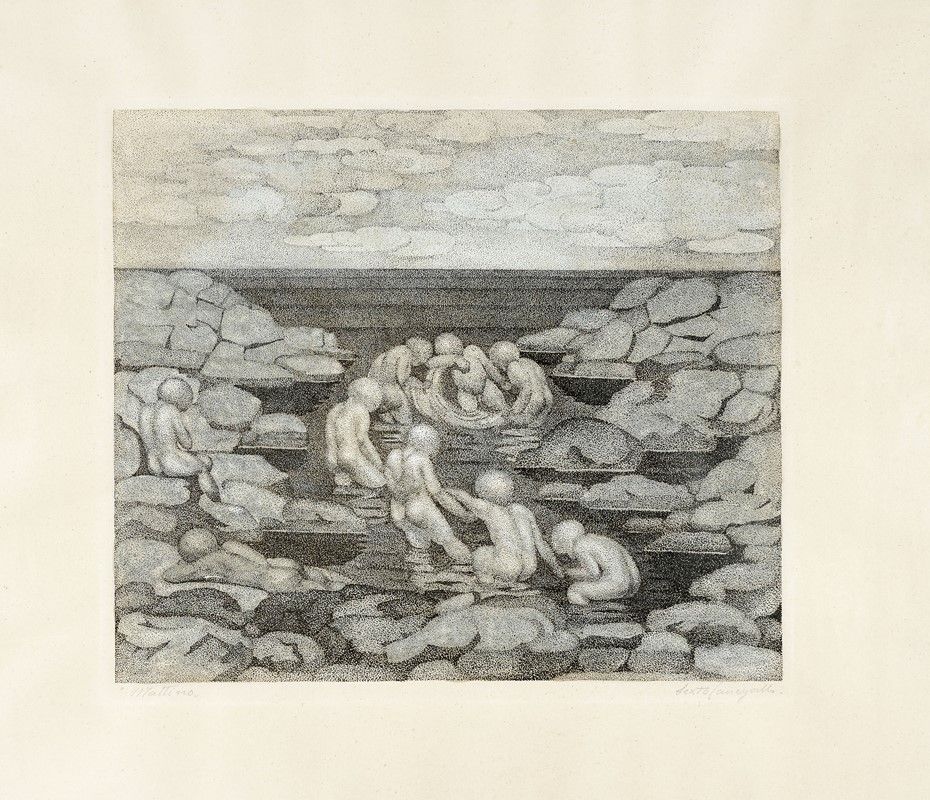 1) Notturno. Litografia. mm 320x400. Foglio: mm 524x610. Firmata a matita in basso a destra. Titolo e numero di tiratura a matita in basso a sinistra. Es. 31/70. 2) Mattino. Litografia a colori. mm 345x400. Foglio: mm 517x600. Firmata a matita in basso a destra, titolata a matita in basso a sinistra.