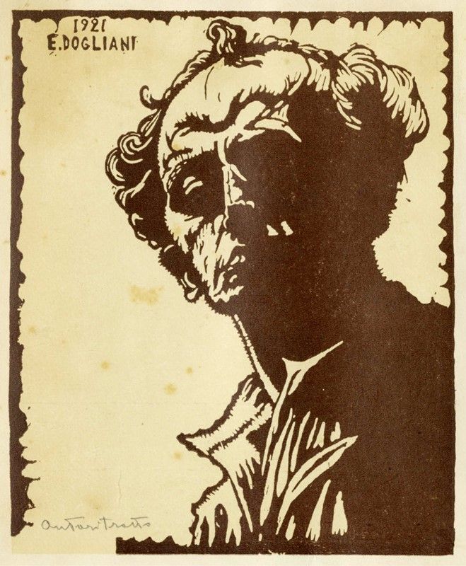1) Autunno marchigiano. 1939. Xilografia. mm 358x235. Foglio: mm 475x325. Firmata e datata a penna e inchiostro di china bruno in basso a destra. Titolata a penna e inchiostro di china bruno in basso a sinistra. Iscrizione "Xilografia (antilettera) quadriennale romana) a penna e inchiostro di china bruno in basso al centro. 2) Figura con cane. Xilografia. mm 170x125. Foglio: mm 180x135. Firmata a penna e inchiostro di china bruno in basso a destra. Al verso del supporto: Dogliani E., Autoritratto. 1921. Xilografia. mm 145x120. Foglio: mm 158x130. Firma e data in lastra in alto a sinistra. Titolata a matita in basso a sinistra.