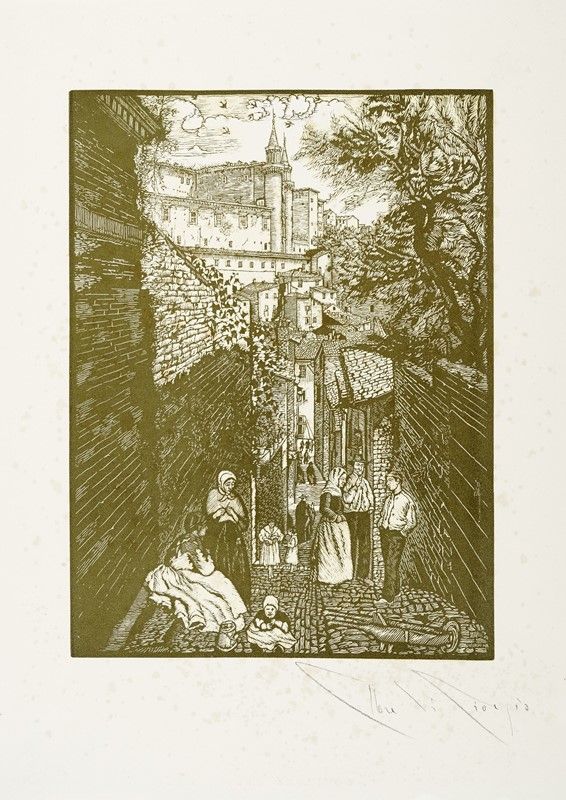 1) Palazzo Ducale a Urbino. 1926. Xilografia a quattro legni su carta vergellata. mm 280x210. Foglio: mm 395x290. ZAMPETTI-CUPPINI SASSI, 71 (con il titolo I torricini). Firmata in lastra in basso a destra, controfirmata a matita in basso a destra. 2) In una via di Urbino. 1920 ca. Xilografia. mm 280x210. Foglio: mm 395x290. Firmata a matita in basso a destra.