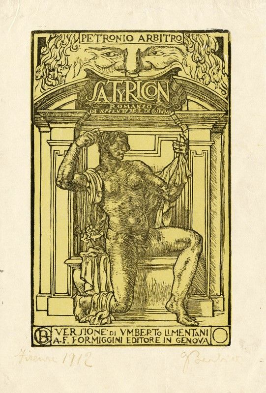 1) Satyricon, Romanzo di avventure e di costumi. 1912. Xilografia. mm 162x102. Foglio: mm 210x141. Titolata e monogrammata in lastra. Firmata a pastello in basso a destra, "Firenze" e data a pastello in basso a sinistra. 2) Ugo Codogni, Sonetti. Xilografia. mm 140x95. Foglio: mm 210x140. Firmata a matita in basso a destra, "Prova di stampa" a matita in basso a sinistra.