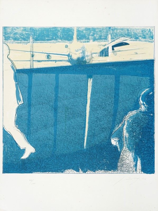 1) Aeroporto. 1970. Litografia. mm 470x470. Foglio: mm 695x500. Firma e data a matita in basso a destra e tiratura in basso a sinistra. es. 40/100. 2) Pagina di mare. 1975. Litografia. mm 553x475. Foglio: mm 595x500. Dedica, firma e data a matita in basso al centro, "prova di stampa" in basso a sinistra e timbro a secco "gg edizioni e stampe d'arte" in basso a destra.