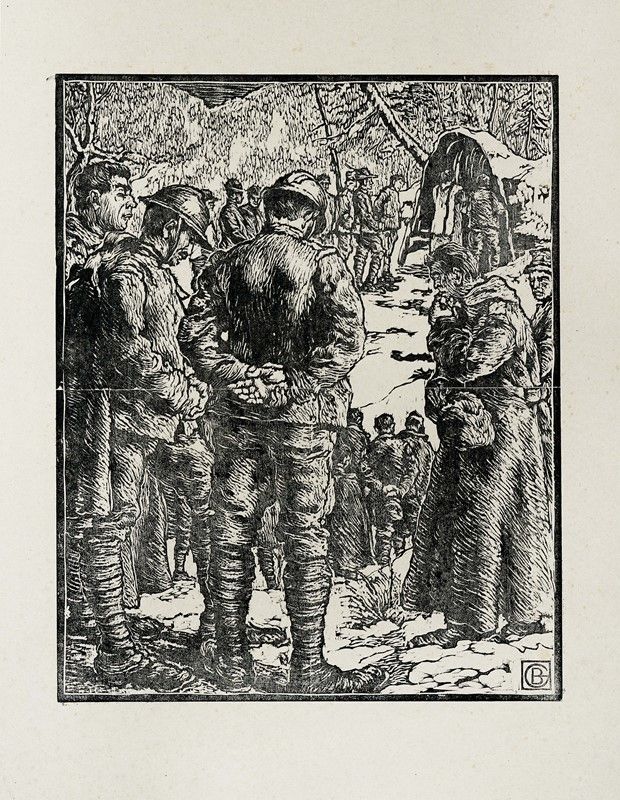 Coppia di xilografie. mm 290/390x235/260. Foglio: mm 385/620x305/480. Entrambe monogrammate in lastra in basso a destra, una firmata a matita. Le due xilografie, in tiratura originale, fanno parte della serie incisa al fronte dove l'artista perse la vita.