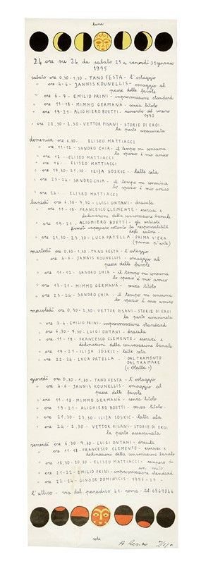 1) Luna Sole. Litografia, penna e inchiostro di china. Il testo è manoscritto. mm 700x204. "24 ore su 24 da sabato 25 a venerdì 31 gennaio 1975". Hanno esposto, tra gli altri: Tano Festa, Jannis Kounellis, Emilio Prini, Alighiero Boetti, Vettor Pisani, Sandro Chia, Luigi Ontani, Francesco Clemente, Ilija Soskic,Gino De Dominicis. 2) Attico in viaggio. Litografia, penna e inchiostro di china. Il testo è manoscritto. mm 647x255.Manifesto per la mostra di sabato 27 marzo 1976 con imbarco al porto fluviale (riva ostiense). Gli artisti a bordo, tra gli altri:Gino De Dominicis, Jannis Kounellis, Mario e Marisa Merz, Luigi Ontani, Nam June Paik, Emilio Prini, Vettor Pisani.