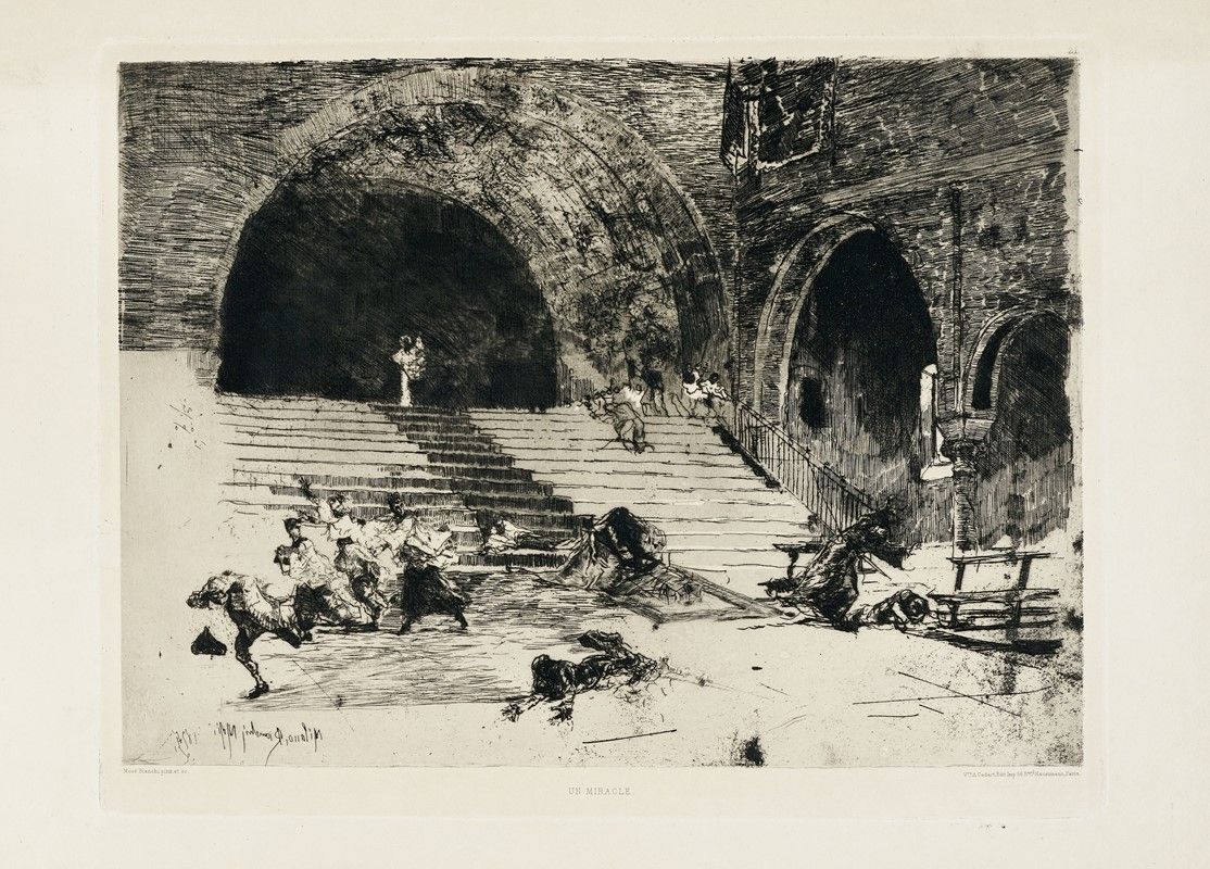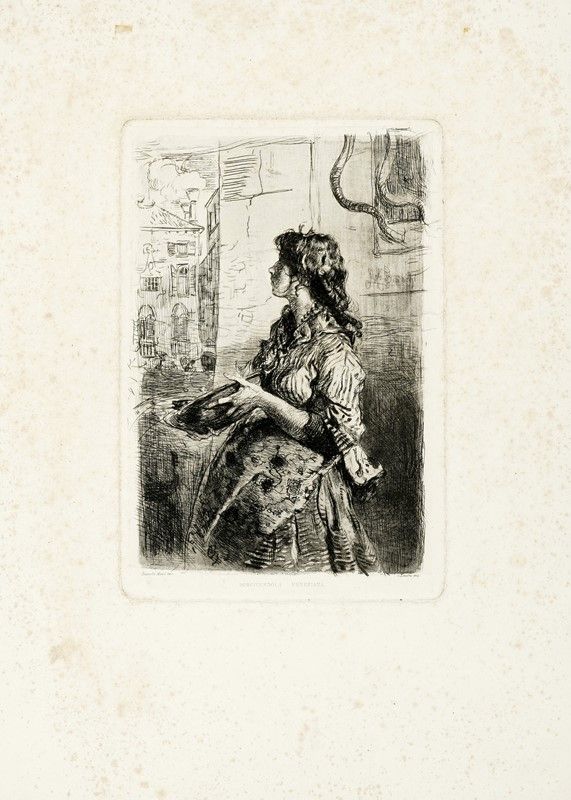1) Un miracle. 1897. Acquaforte su carta vergellata. mm 300x385. Foglio: mm 370x510. "Milano", firma e data in controparte stampate in basso a sinistra della lastra. Titolata in lastra in basso al centro, dati editoriali in lastra lungo i margini. 2) Pescivendola veneziana. 1870. Acquaforte su velina applicata. mm 205x140. Foglio: mm 350x250. VITALI, 34; MEZZETTI, 70 II/II; GIUBBINI, p. 101. Firmata in lastra a destra, titolata in lastra in basso al centro. Dati editoriali lungo i margini. 3) I fratelli sono al campo. Acquaforte. mm 275x180. Foglio: mm 378x290. Titolata in lastra in basso al centro, dati editoriali in lastra lungo i margini.