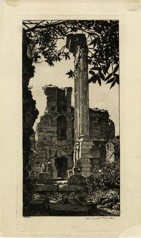 1) Il tempio dei dioscuri. 1918-19. Acquaforte. mm 315x160. Foglio: mm 380x230. BELLINI-ALBERTI, 33. Firmata in lastra in basso a sinistra fuori dall'inciso, controfirmata a penna e inchiostro di china nero in basso a destra. 2) Campanile Sant'Agostino a Perugia. 1919. Acquaforte su carta vergellata. mm 240x300. Foglio: mm 307x410. BELLINI-ALBERTI, 34. Firmata a penna e inchiostro di china in basso a destra, titolata a penna e inchiostro di china in basso al centro. 3) Il lituaio Carlo Bisiach. 1930-34. Litografia. mm 255x227. Foglio: mm 448x333. BELLINI.ABERTI, 68. Firma, titolo e tecnica a penna e inchiostro di china nero lungo il margine inferiore.