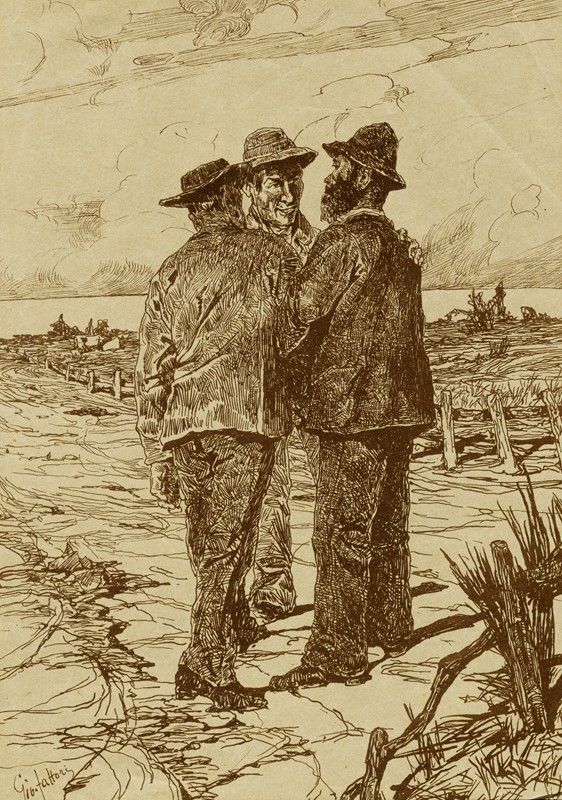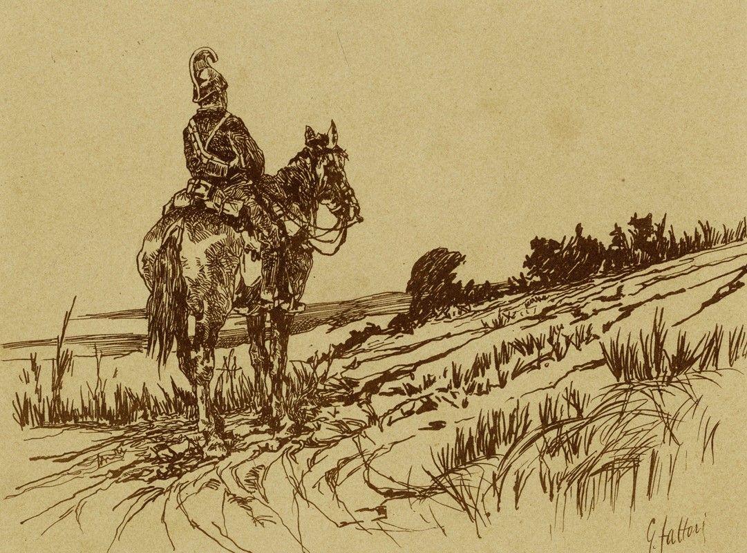 1) Ciociara. 1884. Litografia ad inchiostro marrone. mm 293x210. Foglio: mm 295x215. MALESCI-BABONI, CCI. Firmata in lastra in basso a sinistra. La pietra di questa incisione è stata distrutta, mentre il soggetto verrà ripreso nei quadri Mercato di cavalli in piazza della Trinità a Roma e Strada animata. 2) Tre contadini in conversazione. 1884. Litografia ad inchiostro marrone. mm 313x206. Foglio: mm 315x205. MALESCI-BABONI, CCIV. Firmata in lastra in basso a sinistra. La pietra di questa incisione è stata distrutta, le tre figure compaiono uguale sulla sinistra nella grande tela Mercato a San Godenzo. 3) Lanciere in vedetta. 1884. Litografia ad inchiostro marrone. mm 180x255. Foglio: mm 195x260. MALESCI-BABONI, CCVIII. Firmata in lastra in basso a destra. La pietra di questa incisione è stata distrutta, il soggetto compare con minime modifiche in Lancieri a cavallo e Cavalleggeri in vedetta. Questa litografia risulta applicata al foglio originale della cartella.