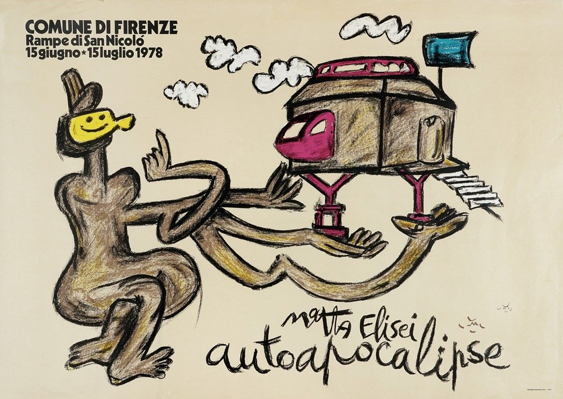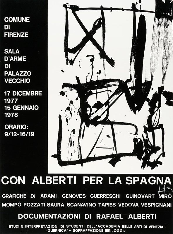 1) Guernica - Sopraffazione ieri, oggi. Manifesto della mostra tenutasi a Firenze, nella Sala D'Arme di Palazzo Vecchio, dal 17 dicembre 1977 al 15 gennaio 1978, con grafiche anche di Adami, Mirò, Pozzati, Scanavino, Tàpies, Vedova e Vespignani. mm 807x592. Firma di Emilio Vedova a pastello bianco in basso a destra. 2) Autoapocalipse. Manifesto del progetto tenutosi in varie città, tra cui Firenze nel 1978, che prevedeva l'edificazione di una casa riciclando vecchie automobili, come provocazione contro il consumismo. mm 686x1000. Monogramma sia in lastra che a matita in basso a destra. 3) Giacomo Manzù, Mostra di Acqueforti 1970-1971, manifesto della mostra tenutasi a Roma dal 22 maggio al 20 giugno 1971. mm 855x592. Firma dell'artista a penna a sfera blu in basso a destra.