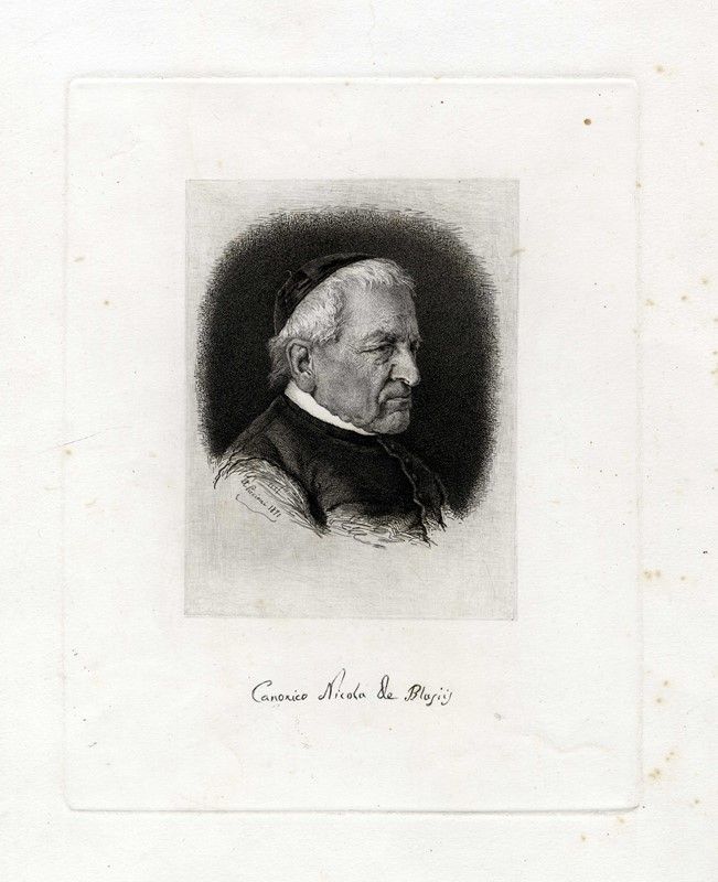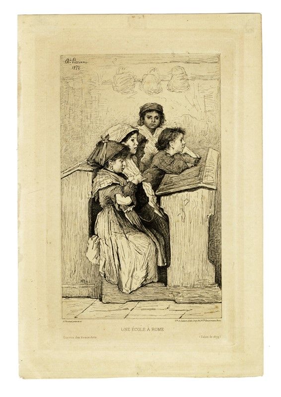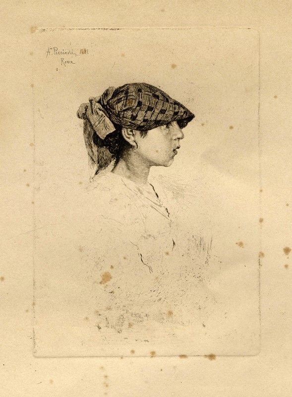 1) Canonico Nicola De Blasis. 1871. Acquaforte. mm 235x188. Foglio: mm 430x315. Firmata, datata e titolata in lastra al margine inferiore. 2) Un ricordo della Via Appia. 1878. Acquaforte su carta applicata. mm 290x225. Foglio: mm 370x290. Firmata e datata in lastra in basso a sinistra, titolata in lastra in basso al centro. Secondo titolo in francese e dati editoriali sempre a stampa lungo il margine inferiore. 3) Une école a Rome. 1879. Acquaforte su carta vergellata filigranata. mm 200x125. Foglio: mm 280x190. Firmata e datata in lastra in alto a sinistra. Titolo e dati editoriali in lastra al margine inferiore. 4) Profilo di giovane ragazza. 1881. Acquaforte. mm 213x145. Foglio: mm 530x375. Firma e data in lastra in alto a sinistra.