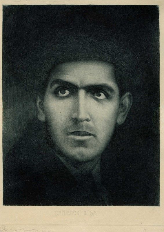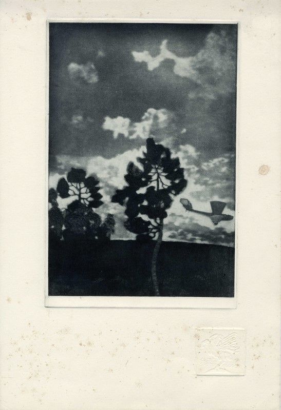 Raccolta di 3 acquetinte raffiguranti aeroplani Caproni in volo. mm 90/300x100/200. Foglio: mm 290/465x225/300. Tutte le opere presentano il timbro a secco raffigurante Pegaso con iscrizione "SENZA COZZAR DIROCCO - CAPRONI" all'angolo inferiore destro di ciascun foglio. Il testo contenuto nel timbro a secco rappresenta il motto coniato da Gabriele D'Annunzio per l'azienda produttrice di aerei e bombardieri. SI AGGIUNGE: Id., Damiano Chiesa. 1916 ca. Acquatinta. mm 240x183. Foglio: mm 255x184. Titolato in lastra al margine inferiore. Esemplare rifilato entro i margini laterali ed il margine superiore della lastra. Nome d'artista iscritto a matita al verso.