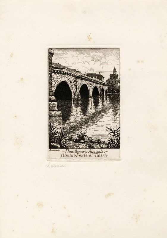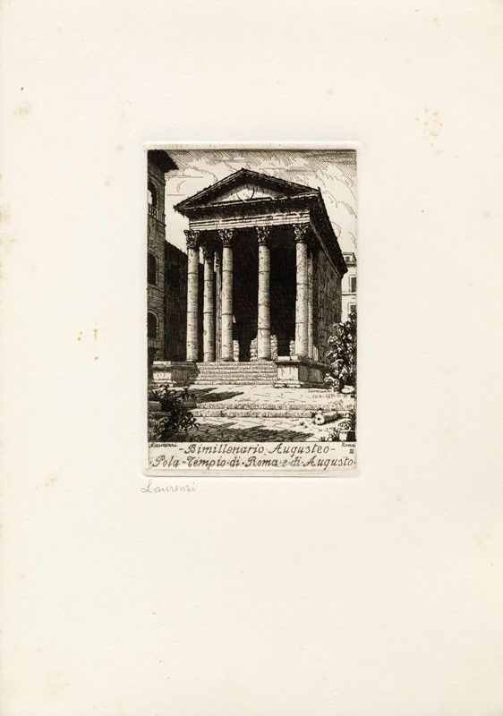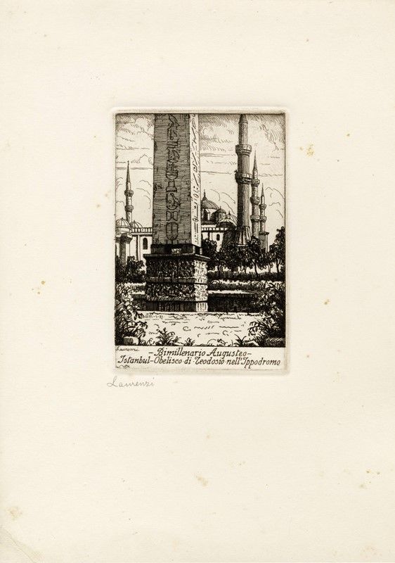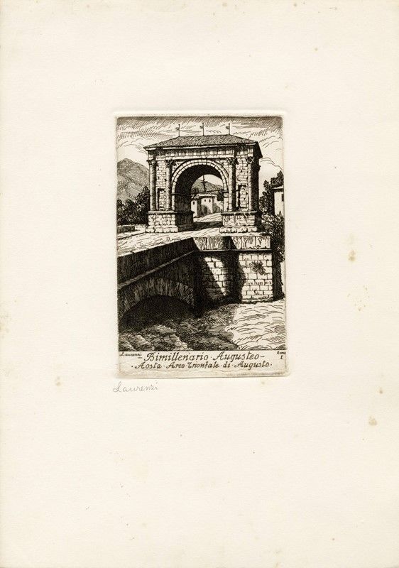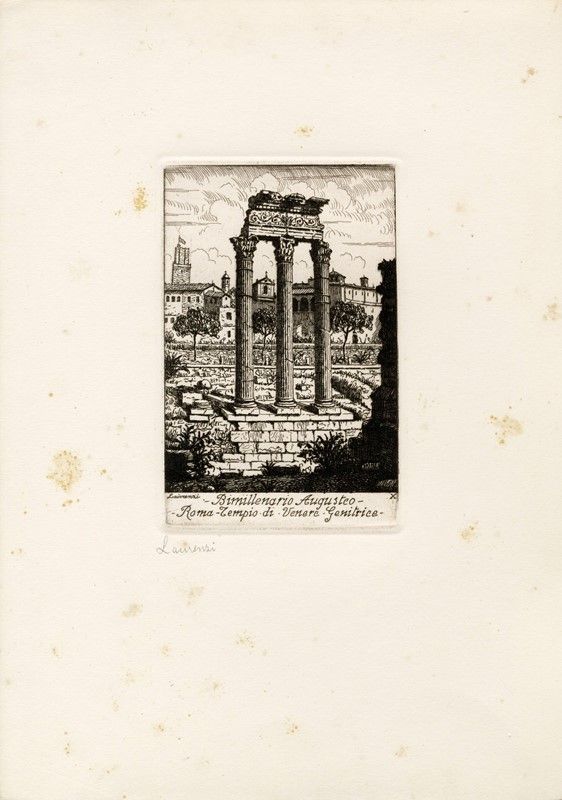 Raccolta di 47 acqueforti (45 vedute incise + 2 frontespizi) contenute in album telato con chiusura a lacci in stoffa. mm 140/210x90/120. Foglio: mm 315x225 cad. Tutte le incisioni sono firmate in lastra, alcune due volte in controparte lungo i margini e controfirmate a matita in basso a sinistra. Bellissime acqueforti realizzate in occasione del Bimillenario Augusteo tenuto tra il 1937 ed il '38, viaggiando per tre anni tra Grecia, Turchia, Tunisia, Libia e tutta una serie di città italiane. Furono successivamente esposte a Roma sotto gli auspici del Ministero delle Colonie. Raro da trovarsi completo.