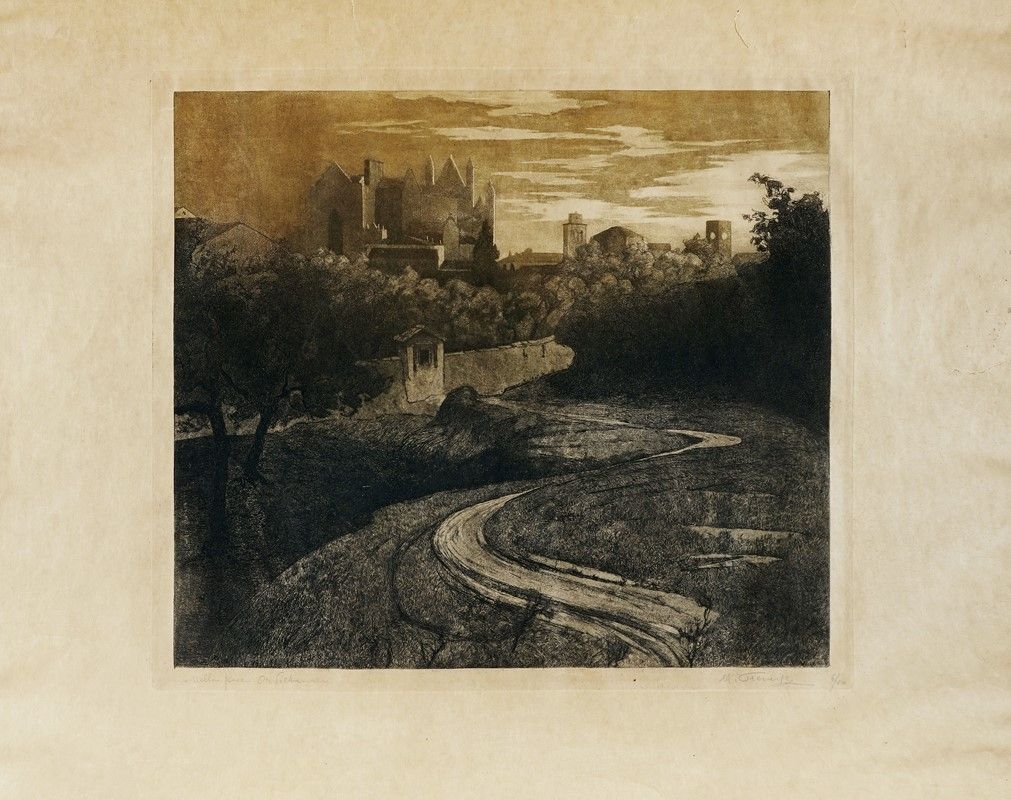 Acquaforte e acquatinta. mm 390x444. Foglio: mm 535x685. Spinazzé, n. 76. Firma e tiratura a matita in basso a destra, titolo a matita in basso a sinistra. Una delle più suggestive incisioni crepuscolari di Prencipe. Es. 6/50.