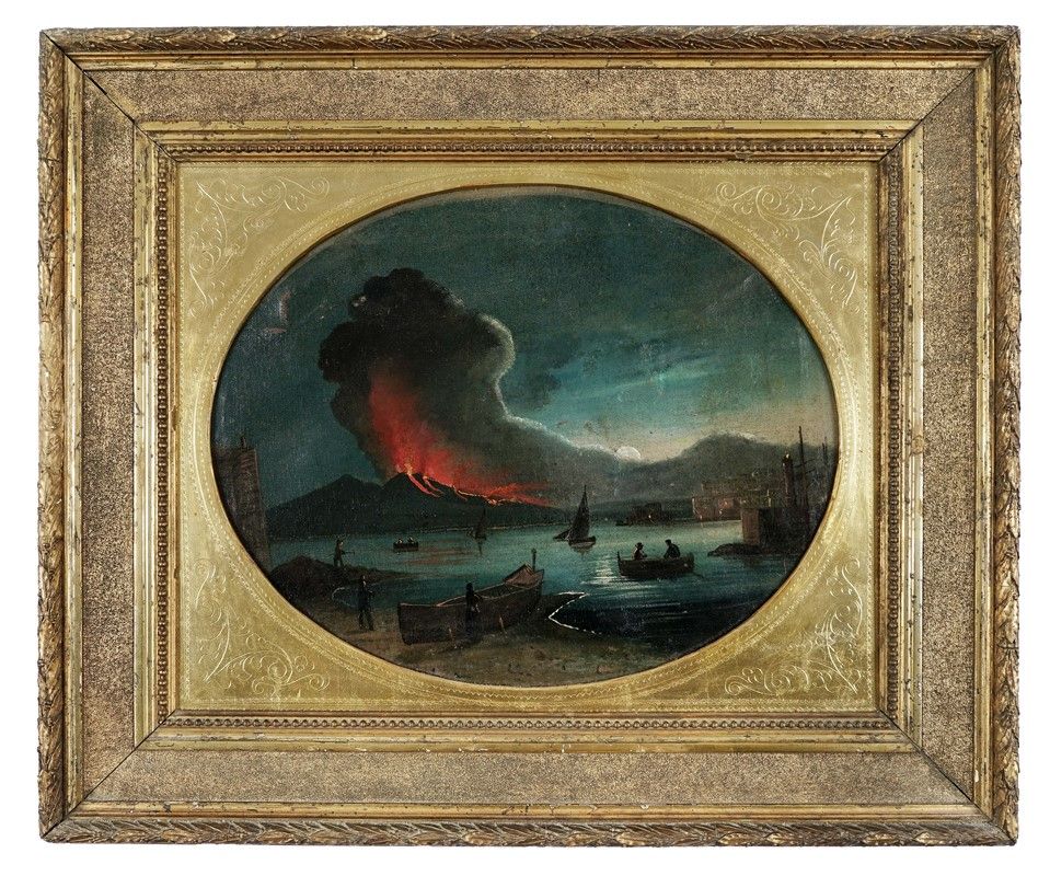 Olio su tela. cm 42x53,5. Meravigliosa scena notturna in formato ovale che cattura l'attimo di eruzione del Vesuvio. Gli unici punti illuminanti sono dati dal contrasto tra la luce fredda del chiaro lunare e l'incandescenza del magma infuocato. Ad osservare la violenta scena troviamo una folla quieta che assiste dalle poche e piccole imbarcazioni. Incornicia il tutto un passe-partout in oro con motivi floreali.