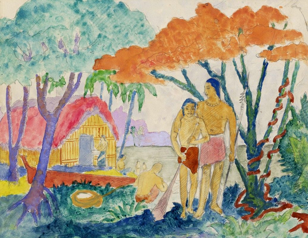 Matita e tempera su carta greve. mm 260x326 e mm 326x260. Provenienza: Sandro Michahelles, Firenze; Massimo Cirulli. Pubblicazioni: Panzetta A., Thayaht e Ram nel Massimo e Sonia Cirulli Archive di New York, 2006, pag. 41, T40A e T40B. La produzione gauguiniana di Thayaht ha una precisa originalità ed una propria evidente qualità pittorica. Il primo periodo, quello di maggiore fertilità creativa, si colloca tra la metà degli anni Venti e i primissimi anni Trenta. L'artista ha dato vita ad alcuni genuini capolavori che, pur partendo dalle suggestioni tahitiane, propongono tagli compositivi assolutamente originali e inconsueti nella pittura di questo periodo. Veri e propri close up cinematografici eseguiti con grande libertà pittorica che affrontano tematiche come il ritratto maschile, singole bellezze apollinee, scene idilliache di vita serena.