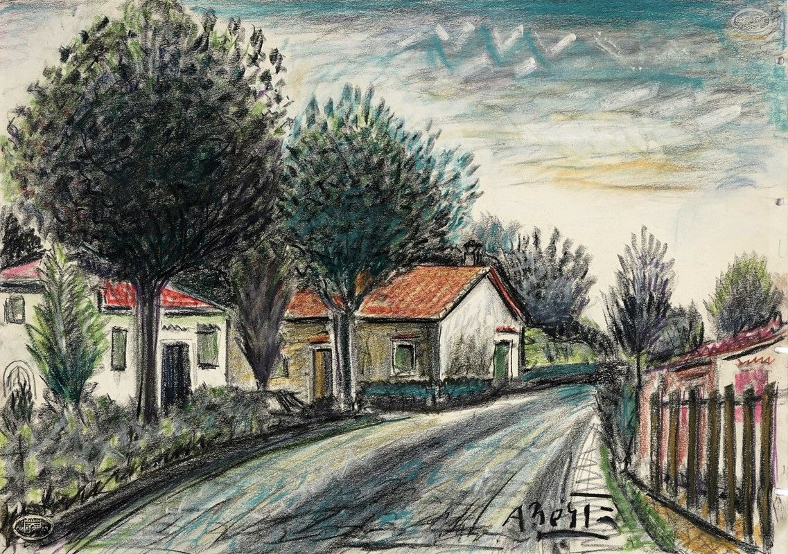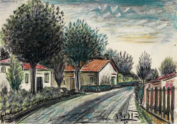 Carboncino e pastelli grassi colorati su carta. mm 420x595. Firmato in basso a destra. Doppio timbro a secco Fabriano agli angoli opposti del foglio.