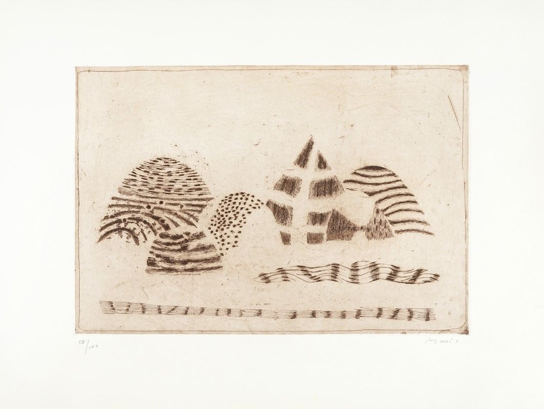 Acquatinta su carta Arches. mm 320x465. Foglio: mm 500x660. Firma a matita in basso a destra e tiratura in basso a sinistra. In basso a sinistra timbro a secco della Galerie Schmücking. Es. 58/100.