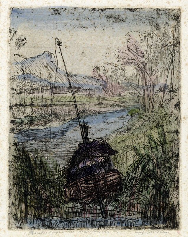 Acquaforte colorata su fondino crema. mm 320x245. Foglio: mm 405x340. Firma, titolo ed iscrizione "esemplare unico" a matita lungo il margine inferiore. Timbro a secco di Luigi Bartolini in basso a destra. Intervento manuale all'acquerello sulla figura. L'artista indica come data di esecuzione il 1936. Rispetto all’esemplare pubblicato in Luigi Bartolini. Uno dei soggetti più famosi e più riprodotti di Bartolini, l'incisione fu presente alla XLVIII Mostra della città di Roma del 1941 e fu esposta alla XXII Biennale di Venezia, giugno-settembre 1942.