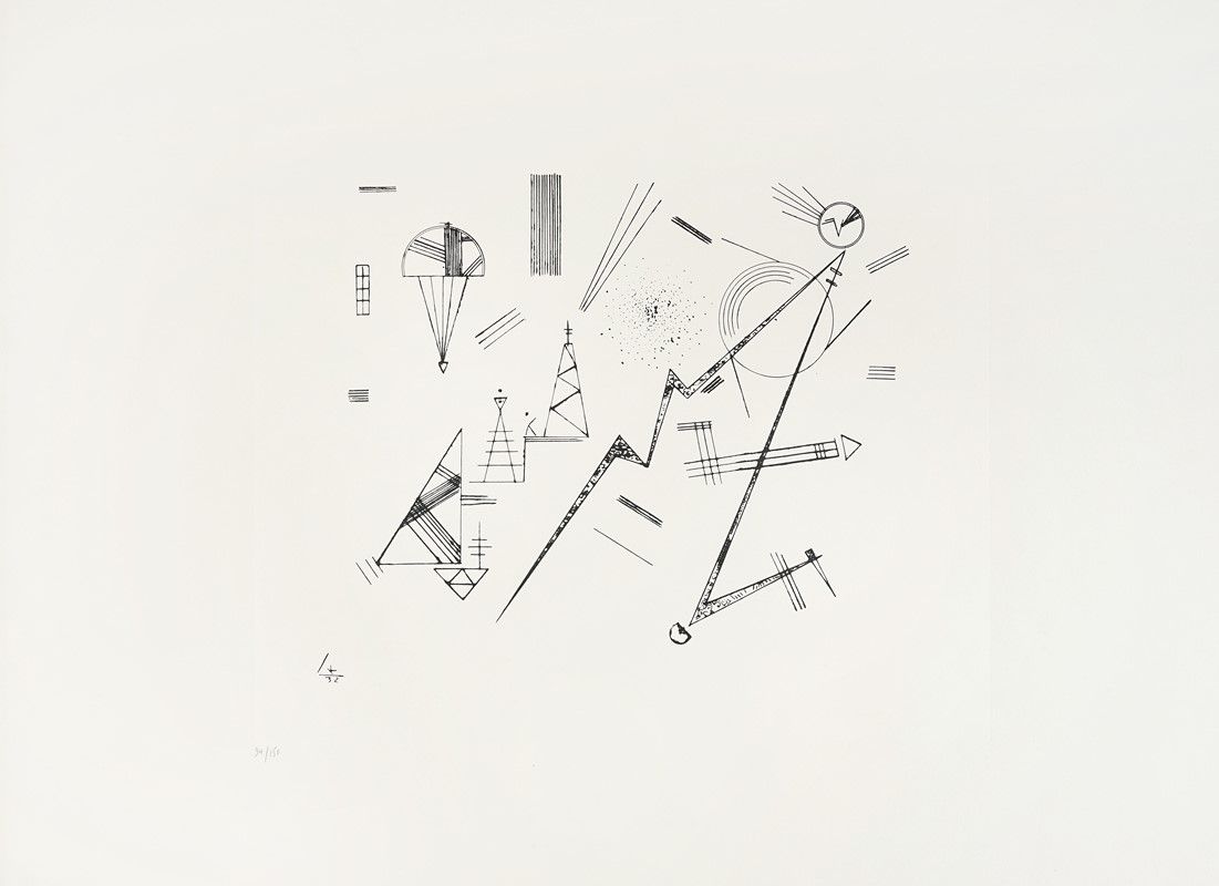 Bella tiratura postuma della celebre incisione di Kandinskij. mm 407x485. Foglio: mm 652x840. Monogramma e data in lastra. Tiratura a matita in basso a sinistra. Firma stampigliata dell'artista al verso all'angolo inferiore destro e, a fianco, la firma manoscritta della moglie Nina Kandinskij. Es. 34/150.