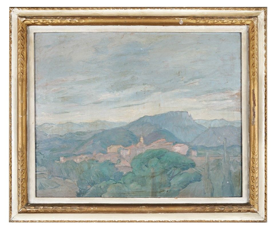 Olio su tavola. cm 60x75. Firmato a pastello rosso in basso a destra. Controfirmato e titolato a pastello rosso al margine inferiore del verso.