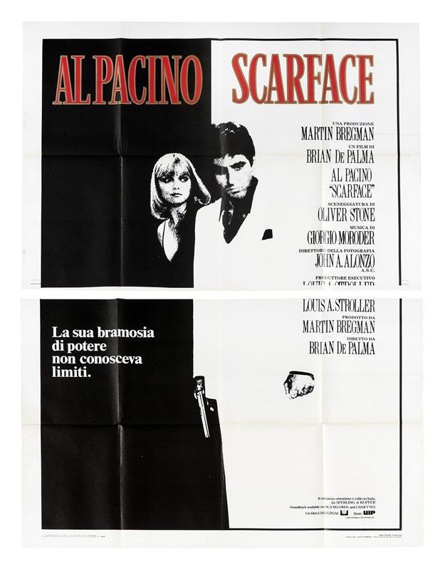 Stampa a reticolo offset in 4 fogli. mm 1250x910 cad. Foglio: mm 1000x1400. Cast e dati editoriali a stampa lungo il margine destro di entrambi i fogli. Iscrizione: "La sua bramosia di potere non conosceva limiti" a stampa al margine sinistro del secondo foglio. Poster in prima edizione italiana del cult noir che vede come giovani protagonisti Al Pacino e Michelle Pfeiffer. Realizzato e distribuito originariamente nel 1983 come remake di Scarface - Lo sfregiato del 1932 diretto da Howard Hawks.