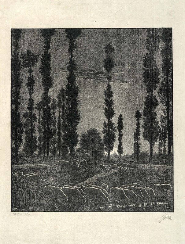 Litografia. mm 445x390. Foglio: mm 535x442. BERTONI-GETTI, 80. CARLI-DJOKIC, 33. Firmata e datata sulla pietra in basso a sinistra. Titolata e firmata a matita sotto alla parte incisa. In entrambi i cataloghi citati la litografia Serenità viene datata al 1922, ma precisiamo che nella pietra compare la data 1919 (anche se poco leggibile). Filigrana "Made in Italy" e "Roma" con lupa agli angoli del foglio.