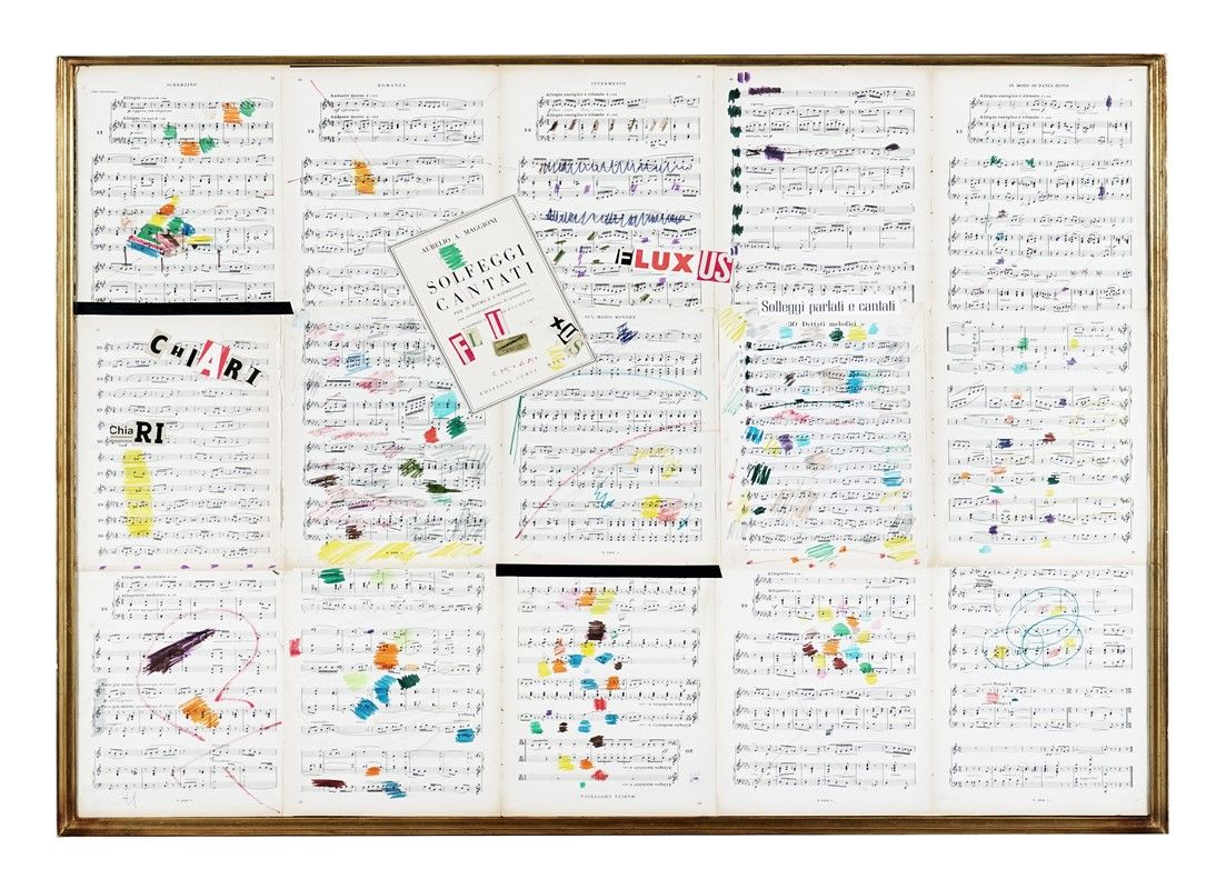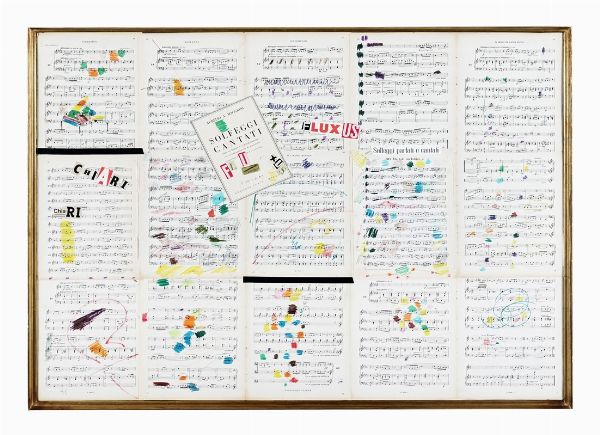 Quindici spartiti applicati a tavola di legno con interventi manuali a pennarello e a collage. cm 87x116. Firma a pennarello e controfirma a collage.