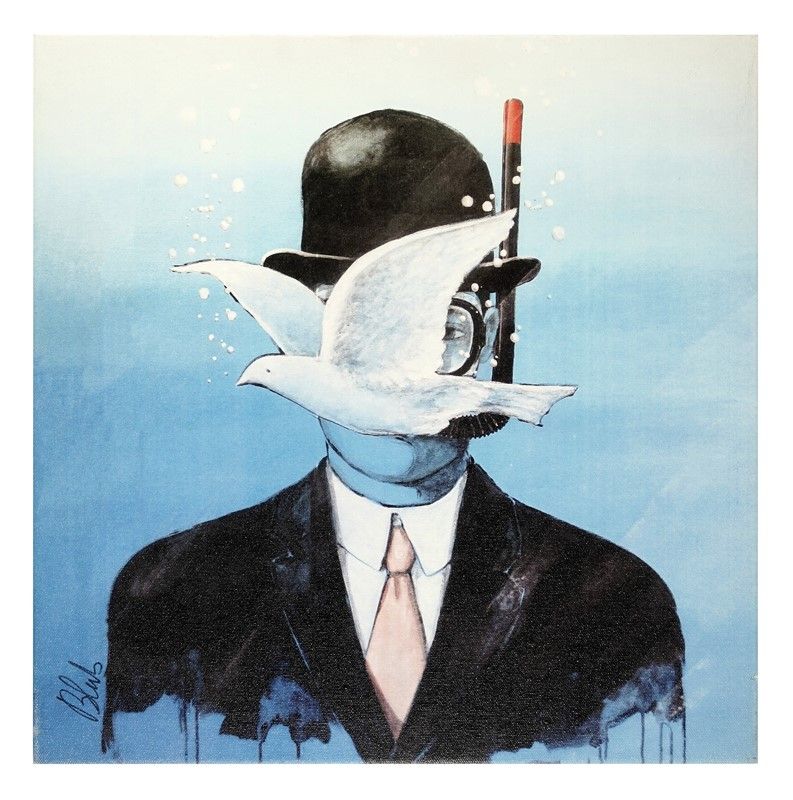 Offset su tela. cm 40x40. Firma a pennarello nero in basso a sinistra. Controfiirmata, datata e titolata al verso a pennarello nero e iscritto: "Copia su tela". Al margine superiore del telaio è applicato il bollino adesivo dell'artista.