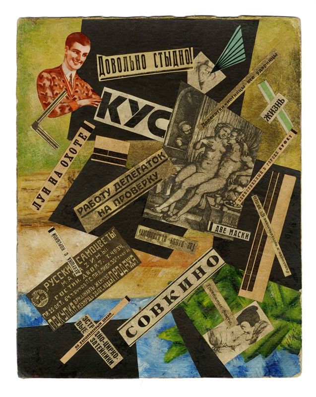 Collage su cartone dipinto. cm 31x24,8. Firma e data in basso a destra. Al verso timbro in cirillico. Provenienza: ArteCentro (ora Lattuada Gallery); collezione toscana.