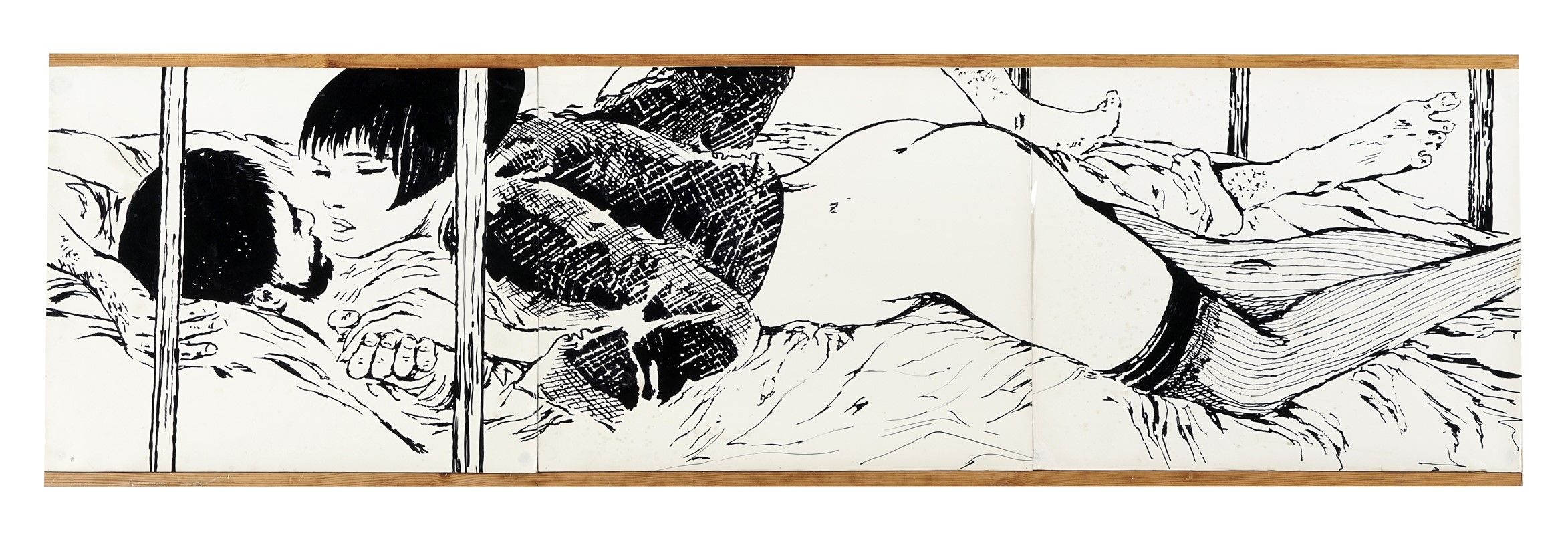 Pennarello a feltro nero su trittico di carta patinata applicata ad anta d'armadio. mm 440x1620. Anta: cm 48x162. Iscrizioni al verso del supporto. Valentina rappresenta la protagonista dell'omonimo fumetto disegnato da Guido Crepax. Nasce nel 1965 come personaggio secondario ne' La curva di Lesmo per poi diventare icona della lunga serie disegnata. In questa scena la vediamo distesa in un erotico momento con il compagno Philip.