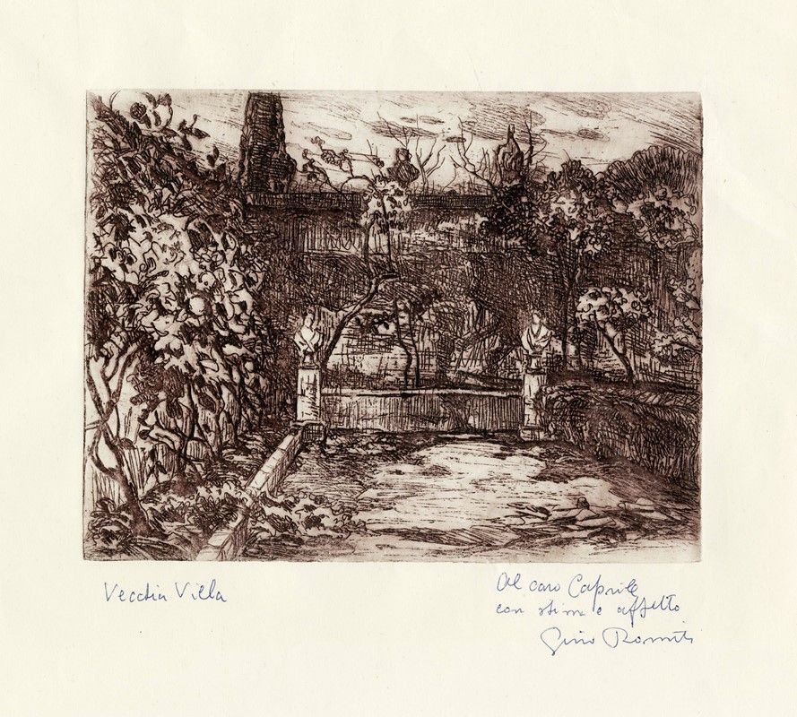 Acquaforte. mm 160x205. Foglio: mm 340x470. Titolata a penna a sfera blu in basso a sinistra, firmata e dedicata a Caprile a penna a sfera blu in basso a destra.