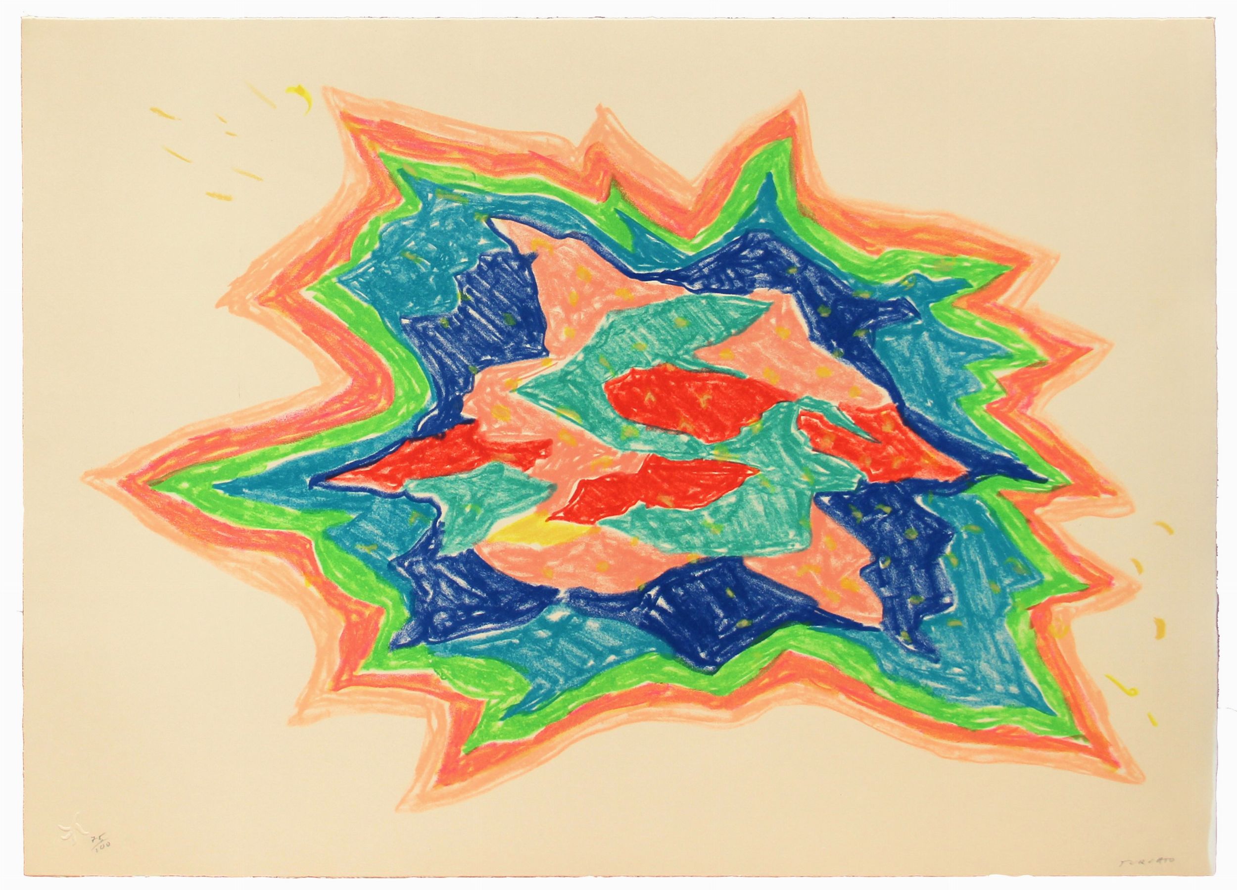 Edizione di 100 esemplariEsemplare n. 75Numerazione 75/100 (in basso a sinistra);firma Turcato (in basso a destra)