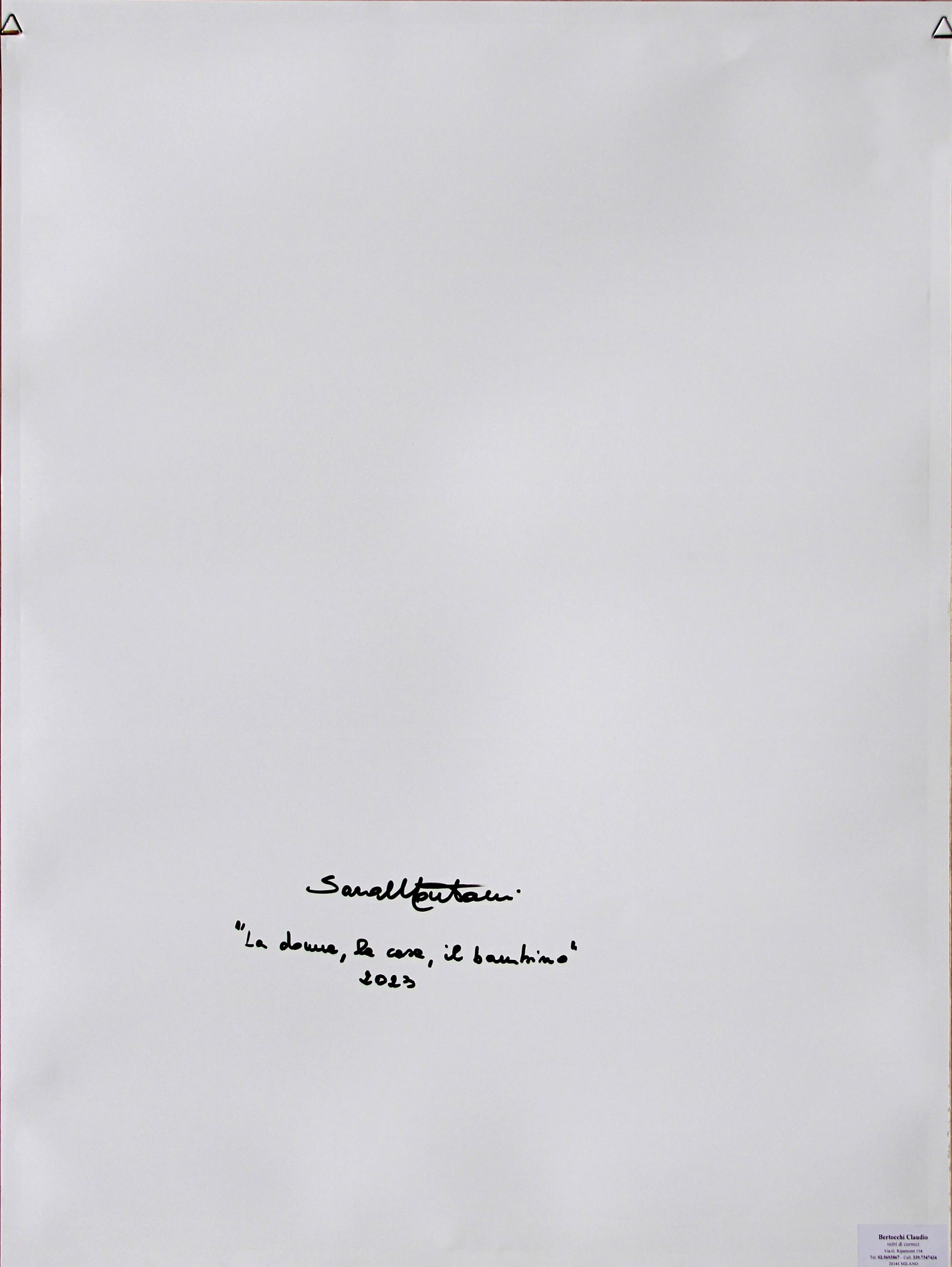 Titolo, scritta La donna, la casa, il bambino, n° 5 maggio 1964 (in basso a sinistra); firma Sara Montani (in basso a destra); timbro a secco dell'artista (in basso a destra) Firma, titolo Sara Montani, La donna, la casa, il bambino (al retro)