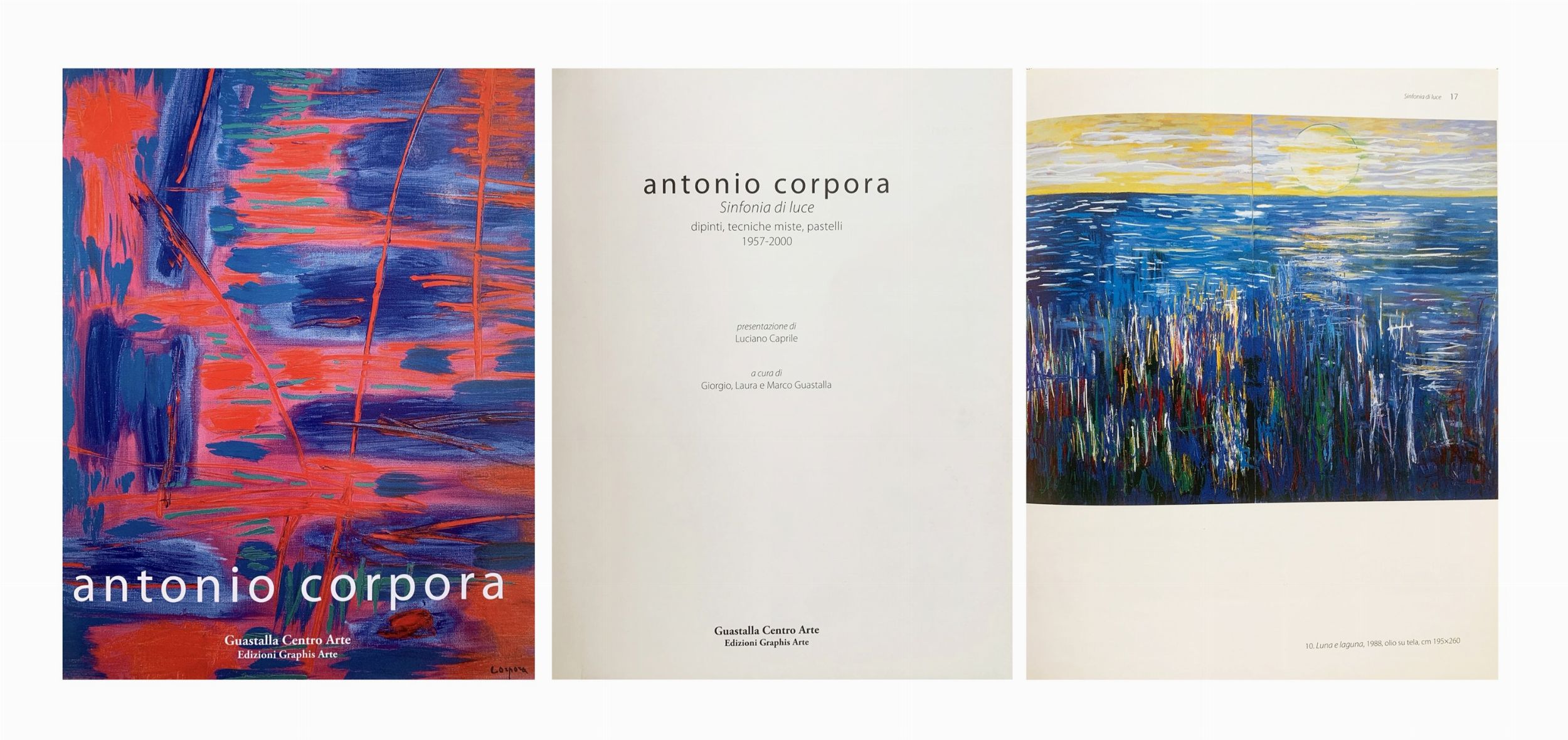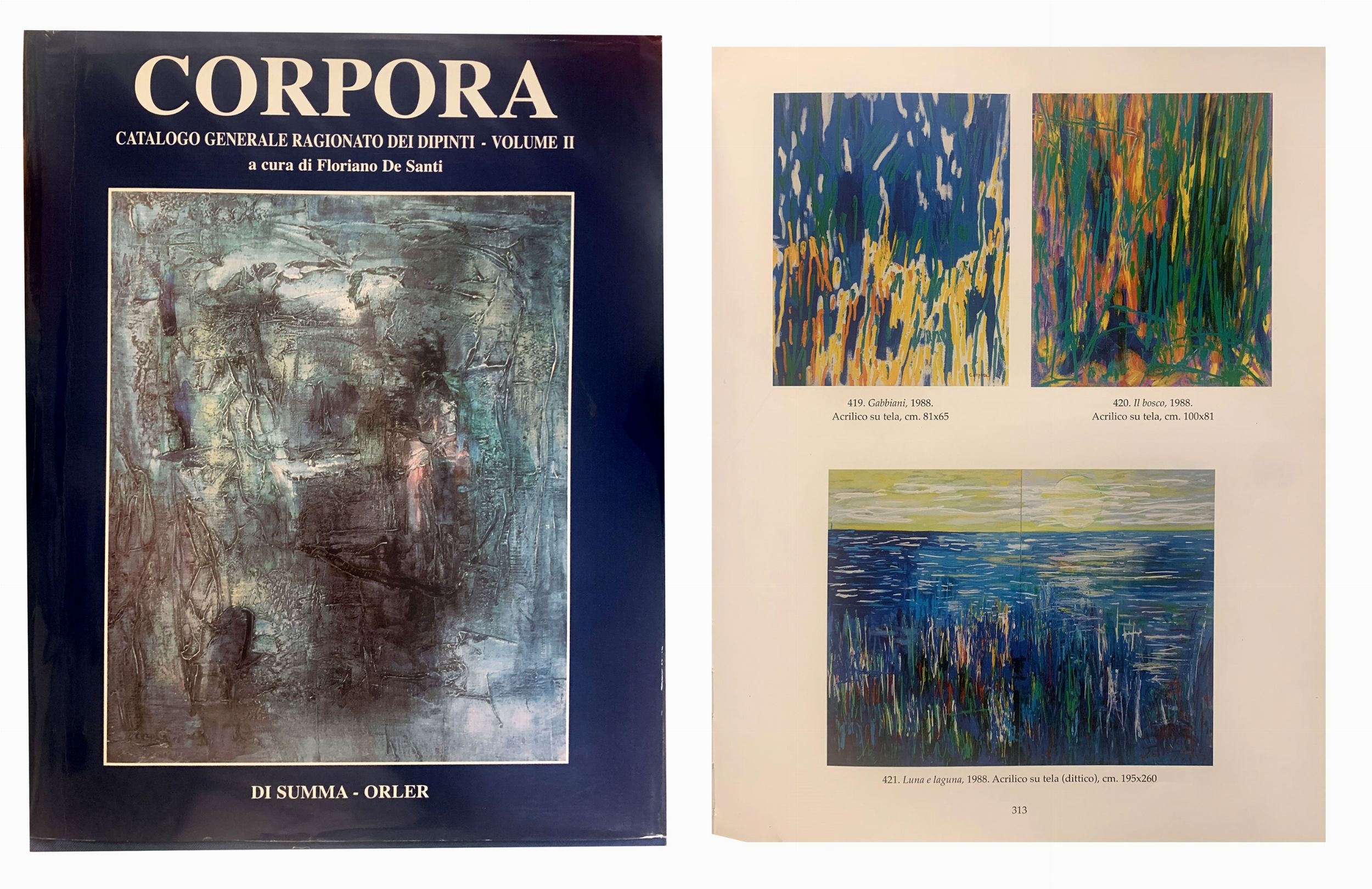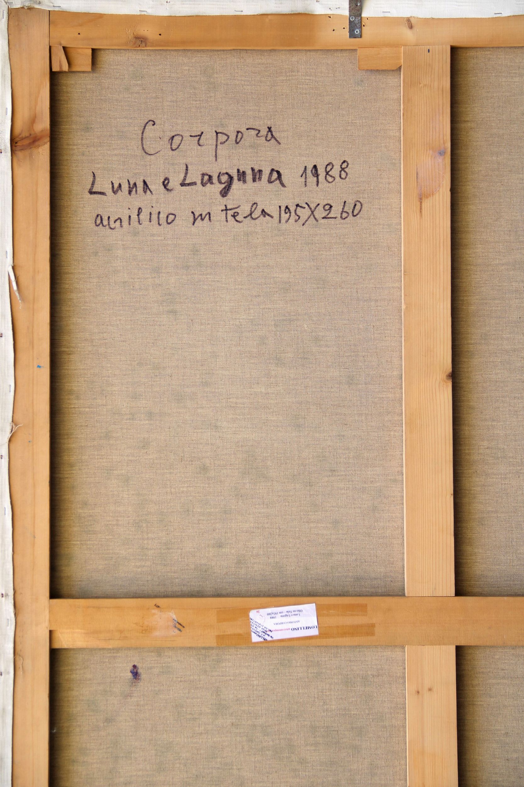DitticoFirma Corpora (in basso a destra)Firma, titolo, data, tecnica, misura Corpora, Luna e laguna, 1988, acrilico su tela, 195x260;etichetta e timbro di Lomellino artecontemporanea, Genova;etichetta di Bruno Tartaglia (al retro)