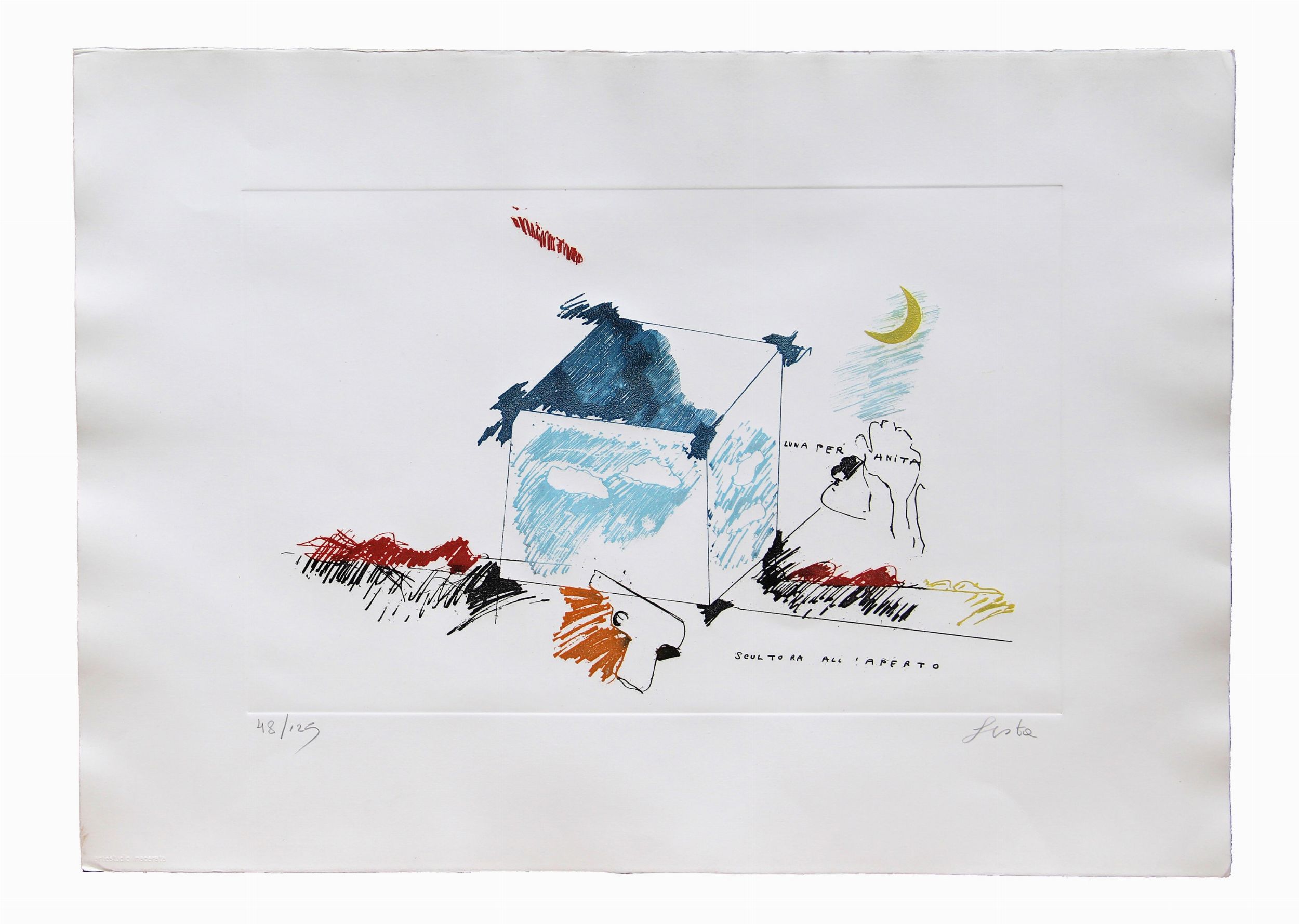 La misura è riferita al foglioLa parte incisa misura cm 31,5x49,5Edizione di 125 esemplariEsemplare n. 48Numerazione 48/125 (in basso a sinistra);firma Festa (in basso a destra)