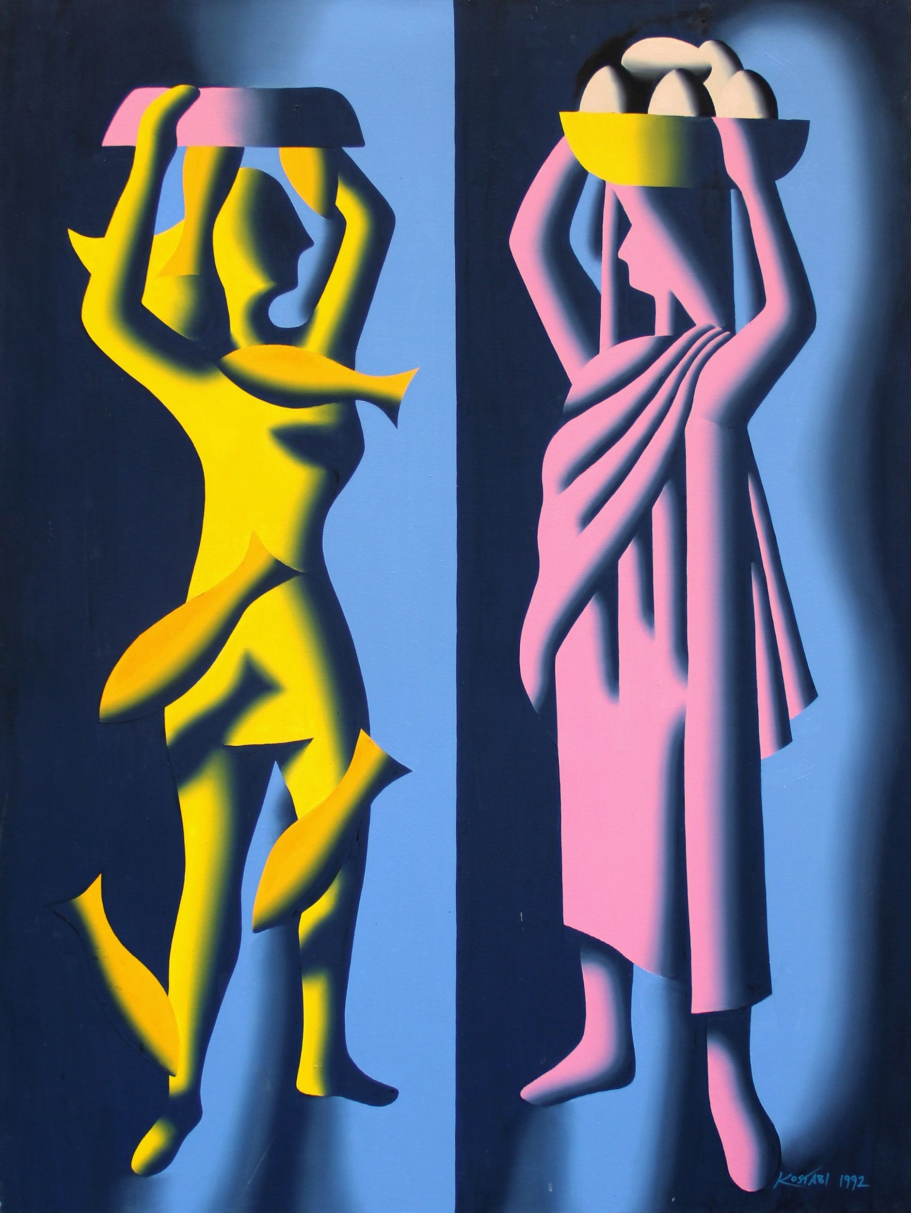 Firma, data Kostabi, 1992 (in basso a destra)Firma, titolo, data, misura, numerazione Kostabi, Two cultures (balance of trade), 1992, 48x36'', 10-8-92-acquirement (al retro)