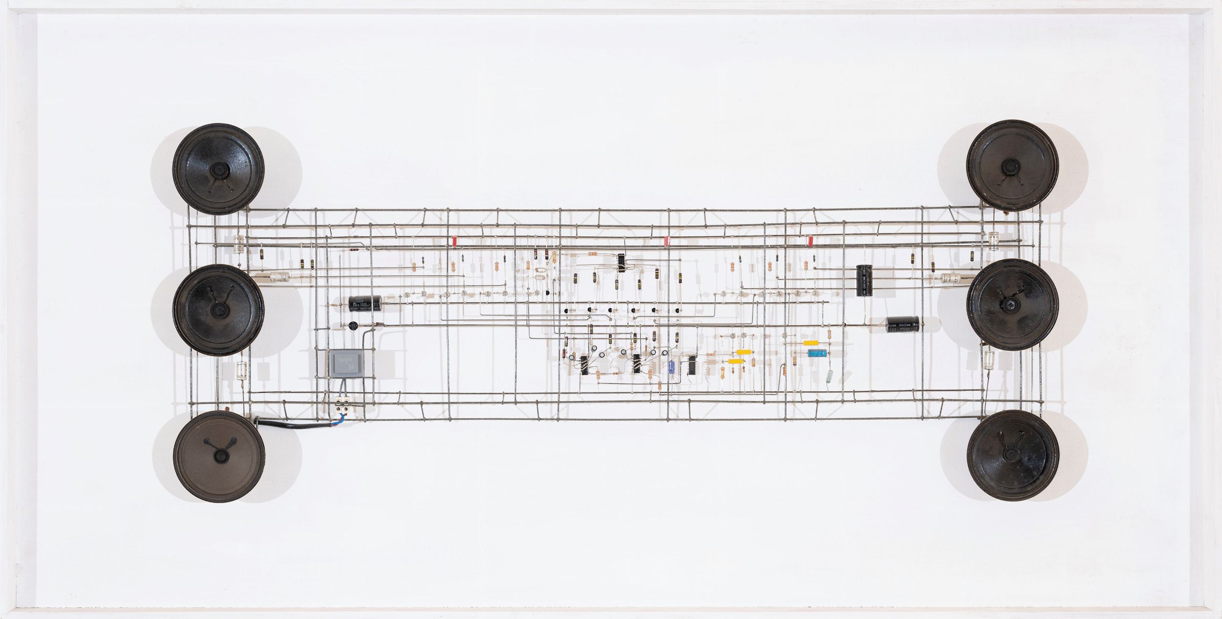 scultura sonora (filo metallico, altoparlanti, componenti elettronici montati su cassetta bianca), cm. 61x121x4