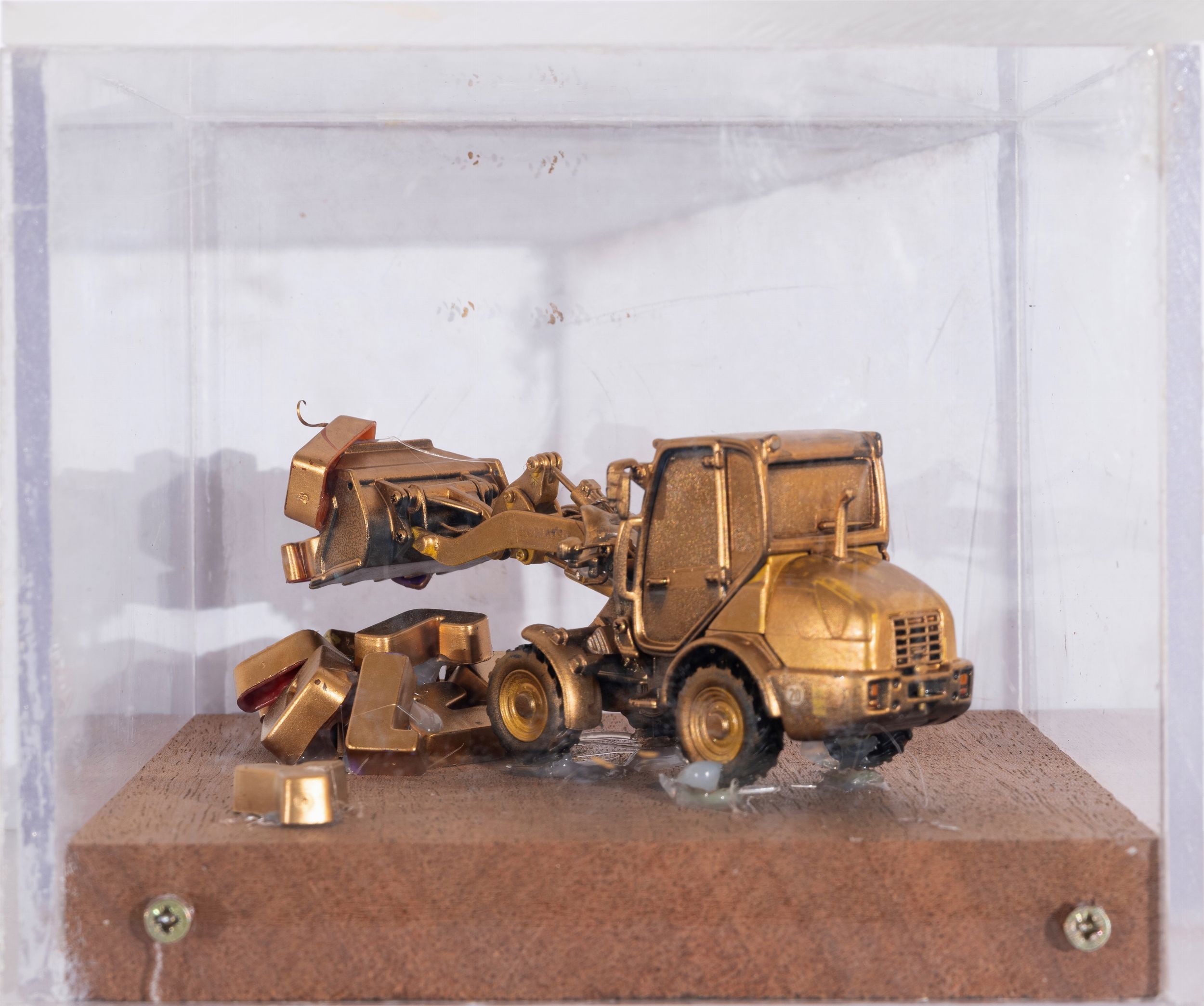 assemblaggio + pittura spray su tavola entro teca di plexiglass, cm. 15x15x12