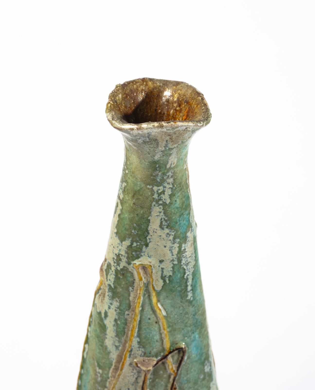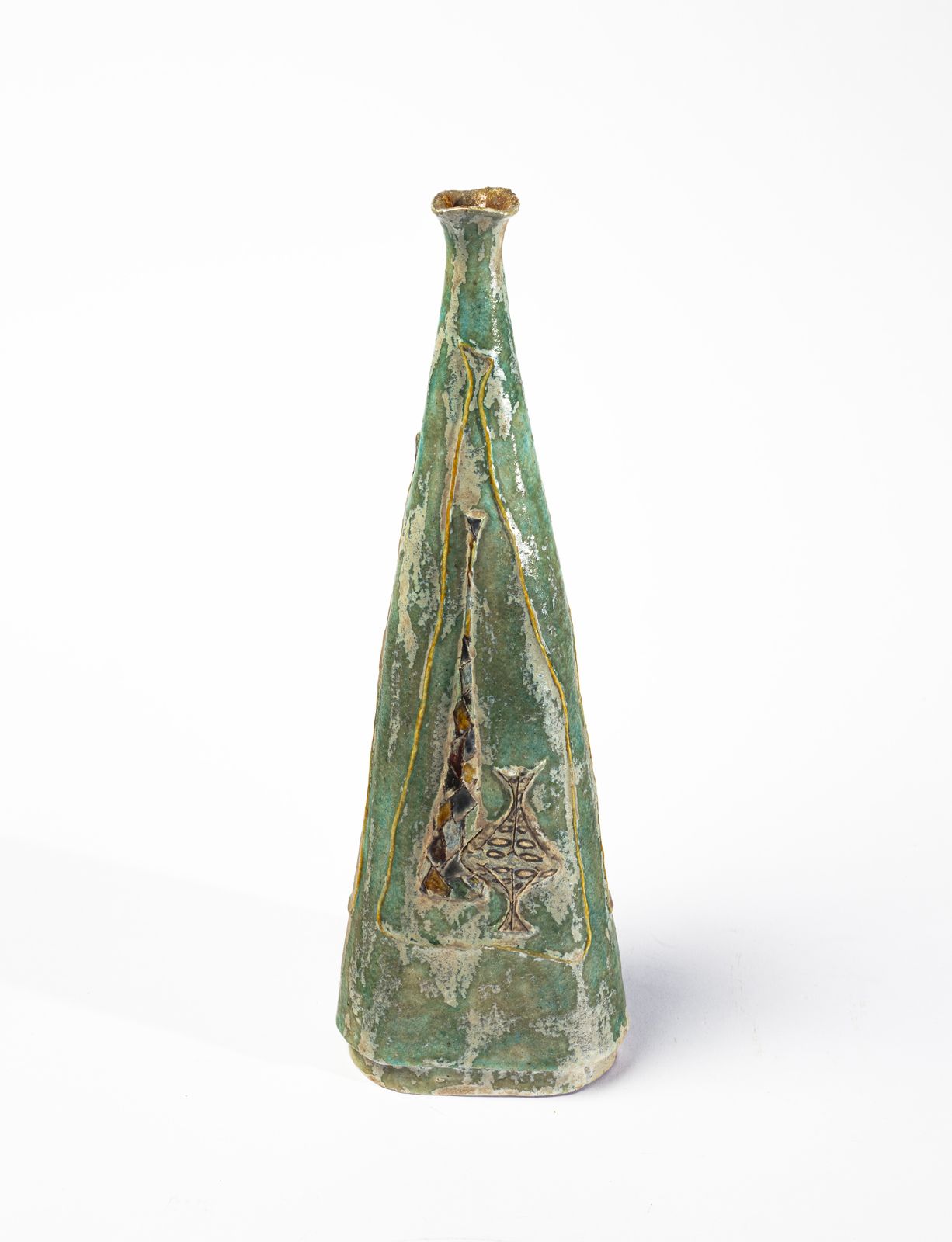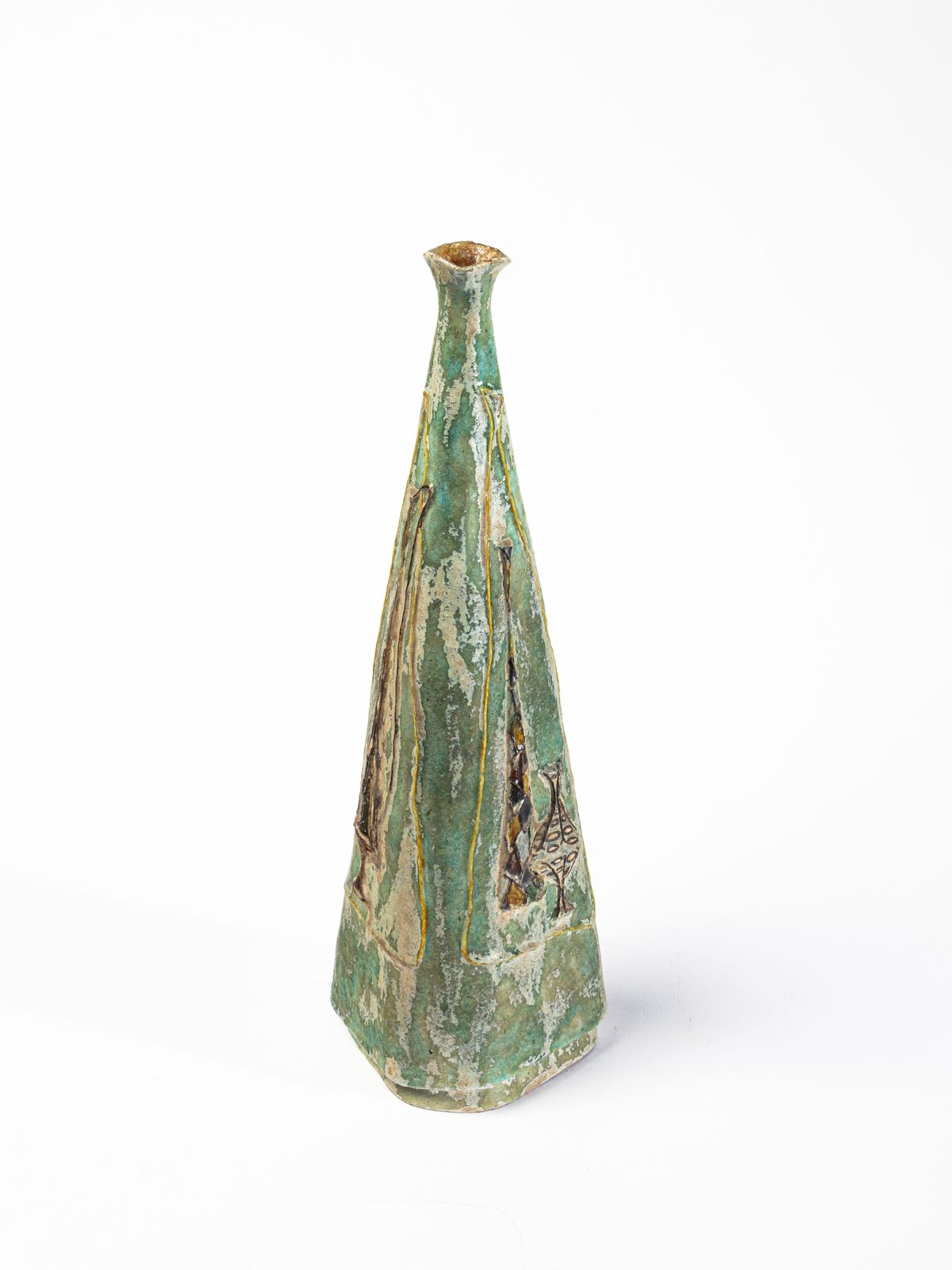 Bottiglia a sezione triangolare decorata a rilievo, Faenza