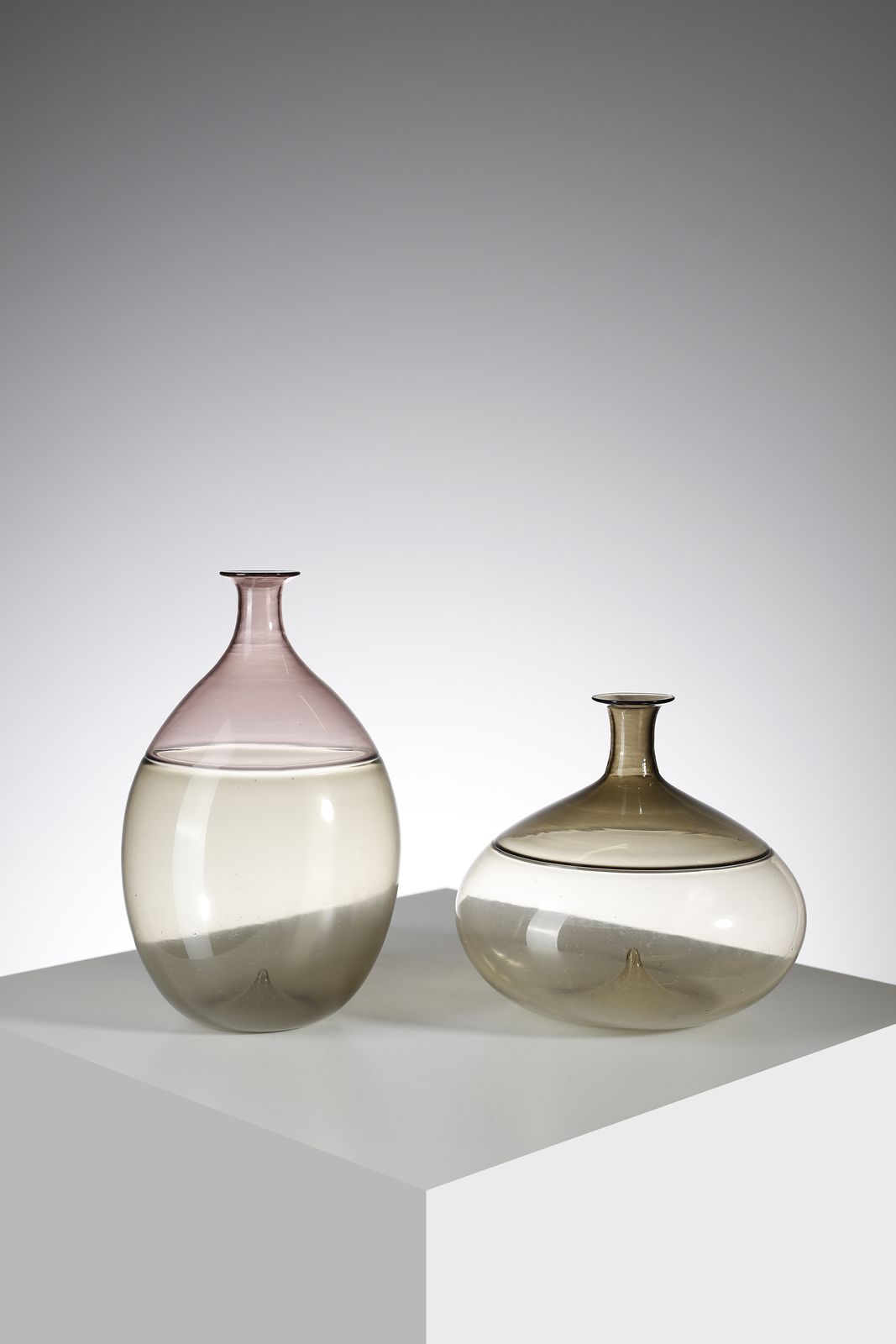 Disegni 502 del Catalogo Verde VeniniFirmati a punta sotto la base 'venini italia tw'Dimensioni: 23 x 15 x 15 cm. 17 x 19 x 19 cm Bibliografia: F. Deboni, I Vetri Venini, vol. II, Allemandi, Torino 2007, fig. 280
